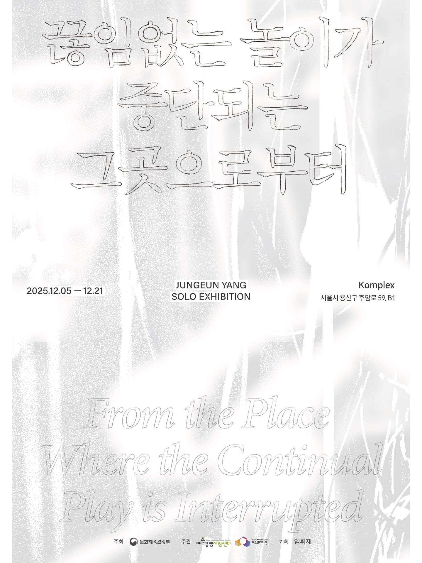 《끊임없는 놀이가 중단되는 그곳으로부터》는 작가가 멈춤의 자리에서 발견한 감각들을 관객에게 건네는 조용한 방식이다. 양정은은 전시를 통해 살아가는 동안 너무 익숙해서 지나쳐버린 지점들을 다시 꺼내어 하나씩 들여다보게 만드는 세계를 보여준다. 작가는 멈춤의 순간을 회피하지 않고, 그 자리에서 작게 흔들리는 것들, 금세 사라지는 것들, 설명할 수 없지만 분명히 존재하는 것들을 만지며 새로운 연결의 방식을 제안한다. 그리고 관계의 틈에서 피어나는 작은 균열들, 그 균열 속에서 다시 시작되는 움직임, 사라지지 않는 흔적 하나하나가 세계와의 새로운 관계를 모색하는 조용하고도 단단한 시도를 남긴다. (글:임휘재, 전시 서문 중 발췌)