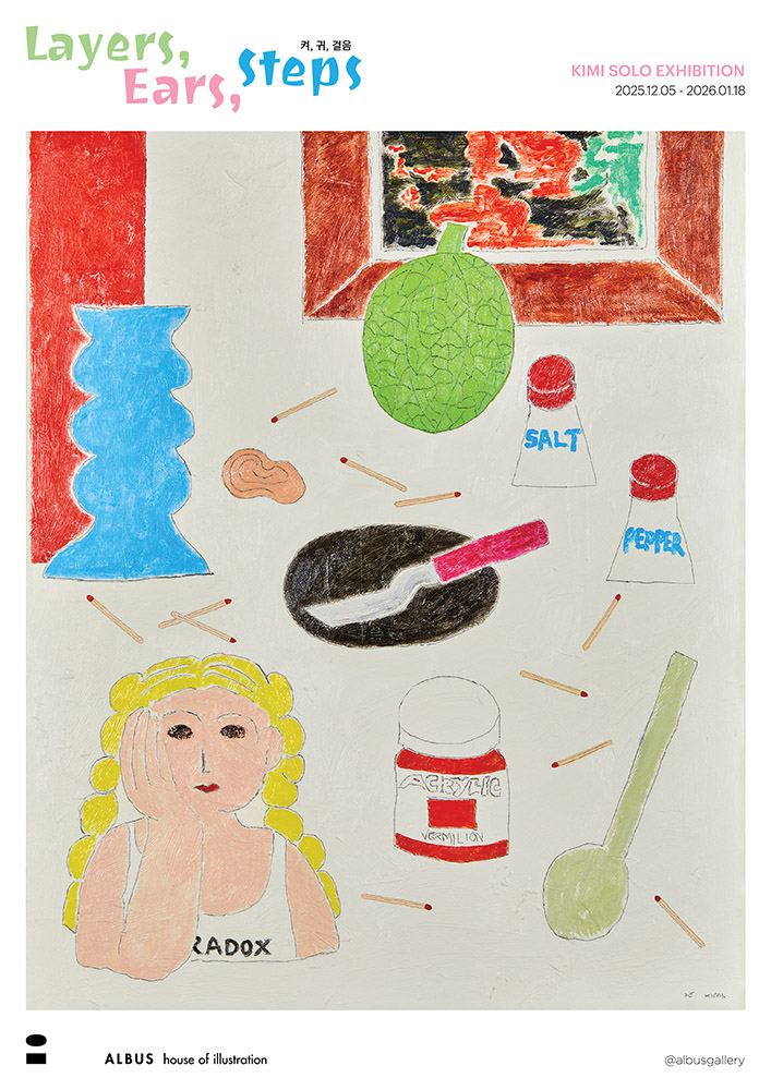 알부스 갤러리는 2025년 12월 5일부터 2026년 1월 18일까지 키미의 개인전 <켜, 귀, 걸음 Layers, Ears, Steps>을 개최한다. 이번 전시는 알부스 갤러리와 3년 만에 만난 두 번째 개인전이다. 작가는 지속적으로 이어온 ‘사랑’이라는 주제를 다시 마주하며, 작가의 내면에서 켜켜이 쌓아온 작품들로 사랑이 어떻게 삶을 지탱하는지를 보여준다.