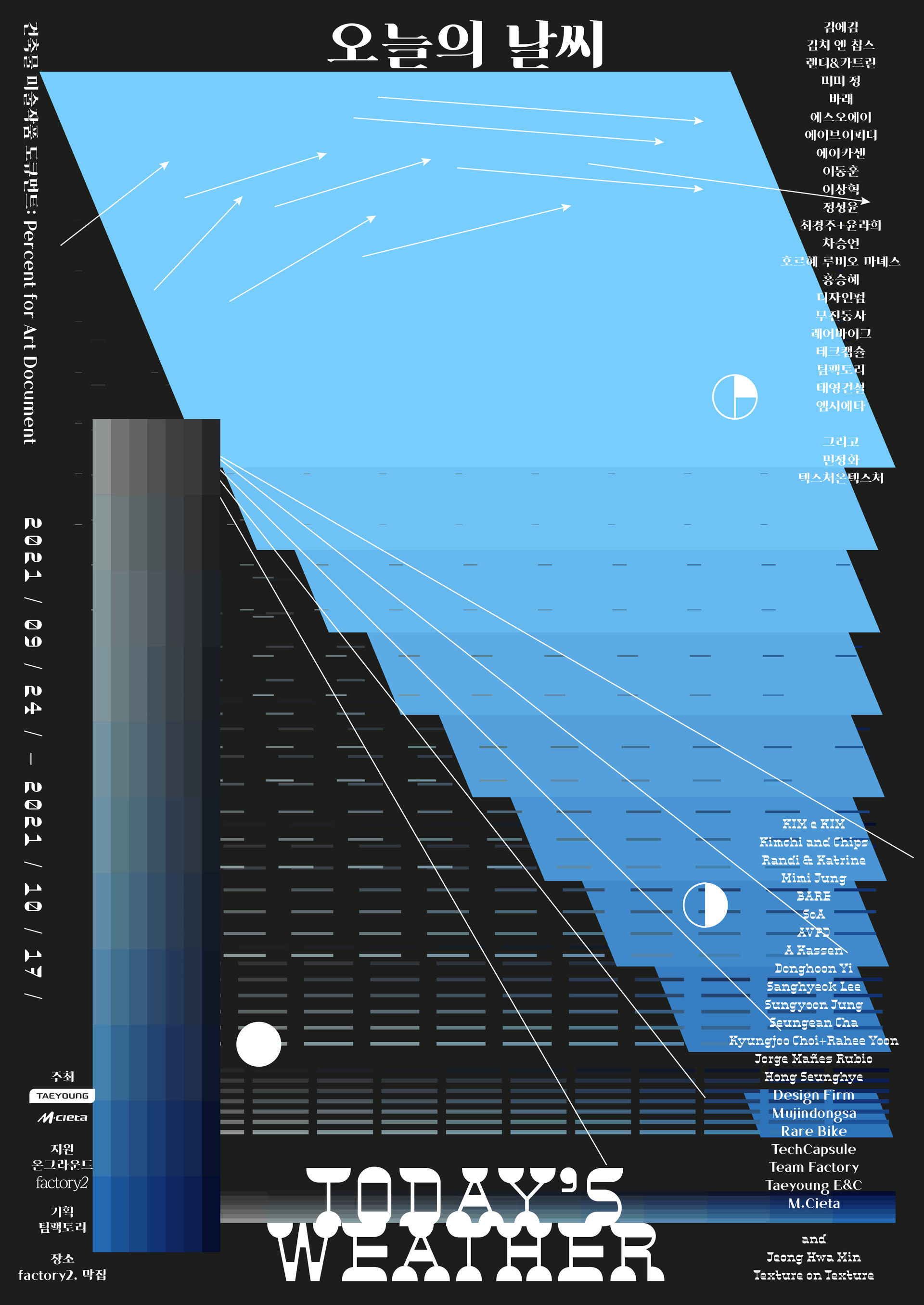 《건축물 미술작품 도큐먼트 : 오늘의 날씨》는 건축물 미술작품 제도의 확장 가능성을 제시하는 전시이다. 퍼블릭아트를 중심으로 주제와 장소 리서치, 기획, 실행, 커미션 등 프로젝트 전반의 업무를 담당하는 전문 기획팀, 팀팩토리(Team Factory)는 2018년부터 최근까지 광명 유 플래닛(U Planet) 복합단지 내 ‘오늘의 날씨’라는 주제 아래 ‘건축물 미술작품 제도’의 일환으로 3년에 걸친 퍼블릭아트 프로젝트, 《오늘의 날씨》를 총괄 진행한 바 있다. 《건축물 미술작품 도큐먼트 : 오늘의 날씨》는 그 과정과 기록을 담은 전시이다.