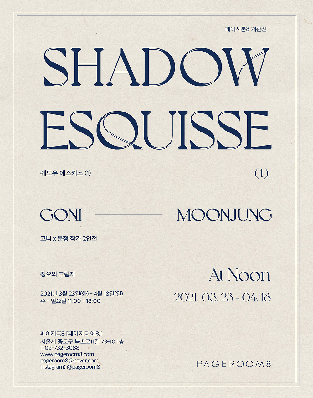 PAGEROOM8(페이지룸8) [페이지룸에잇]은 2018년에 설립한 시각예술 전시와 책을 만드는 1인 기업이다. 페이지룸8 개관전 《Shadow Esquisse –정오의 그림자-》는 작가의 작품에서 보여지는 시그니처 제스처를 ‘드로잉 요소’에서 찾고자 기획하였다. 그리고 시리즈 전시로 엮이는 장기 프로젝트이다. 2021년에 2인전 총 4회, 작가 8명의 전시를 개최할 예정이며 내년 2022년으로 이어가고자 한다. 그리고 참여작가 인터뷰와 기획자 에피소드 글 등을 담아 국내외로 보급할 수 있는 책을 출간할 계획이 있다.