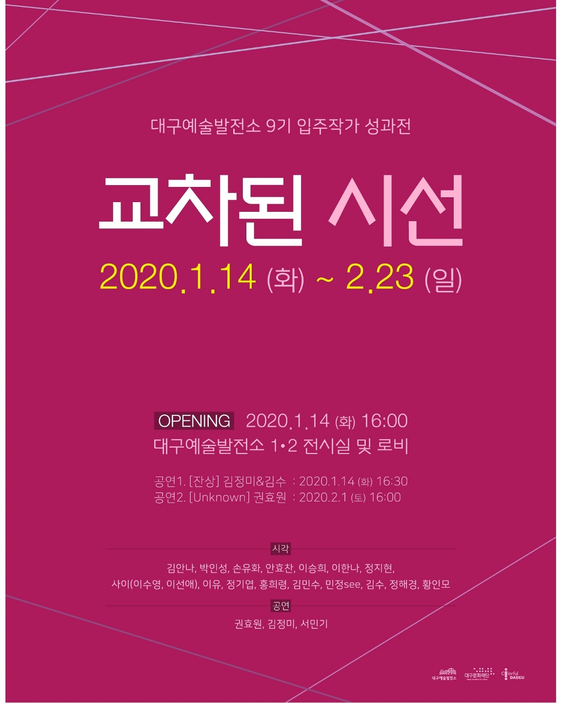 대구예술발전소는 2020년 첫 전시로 《교차된 시선》展을 개최한다. 《교차된 시선》展은 대구예술발전소 9기 입주작가 성과전으로 시각·공연 분야에서 활동하고 있는 20명의 입주 작가들이 참여한다. 이번 전시는 9기 입주작가들이 던지는 다양한 시선들이 서로 조우하고, 충돌하고, 공존하고, 대립하는 공간을 창조한다. 이러한 ‘교차된 시선’은 오늘날 예술가들이 제기하고 다루려는 문제들과 미학적으로 긴밀하게 얽혀있다. 그것은 현대예술(Contemporary Art)이 세계와의 관계를 창조하기 위해 이질적인 단위들을 일정한 수준에서 결합하는 형식의 창조와 연관되어 있기 때문이다. 9기 입주작들은 이와같은 '교차된 시선'을 통해 얘기치 못한 에너지를 분출하는 다양한 작품을 선보이게 될 것이다.