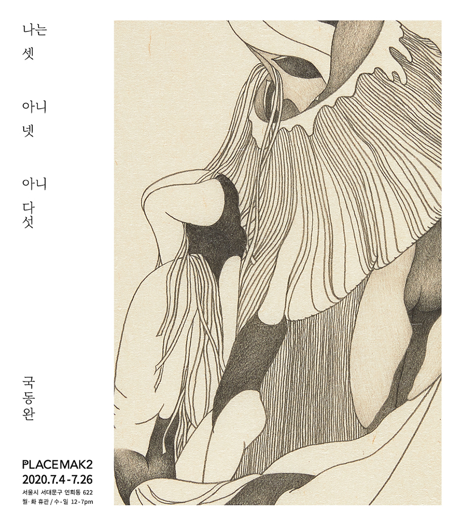 국동완의 이번 전시 제목이기도 한 《나는 셋 아니 넷 아니 다섯》(플레이스막2, 2020)은 동명의 그림과 글에서 등장하는 대상이 소유한 개체성에 대한 강한 애착으로 둘러싸여 있다. 동시에 이러한 개체성을 초월하고자 하는 욕망은 여럿으로 끊임없이 쪼개지는 과정과 검정이라는 색이 상징하는 것들로 유추해 볼 수 있다. 서로 반대되는 방향으로 작용하는 애착과 욕망은 역설적이게도 삶이자 죽음을 함축한다. 드로잉과 글에서 절묘하게 드러나는 긴장감과 불안감은 ‘나’라는 존재가 인식하고 있는 다양한 상념들이 모여 세상 밖으로 뻗어 나가고자 삶 그 자체를 활성화하려는 정신의 표현이기도 하지만, 동시에 삶 그 자체로는 환원될 수 없는 의식에 대한 모순된 방향이기도 하다. 이처럼, 모순적일 수밖에 없는 현실에서의 타자(작가)와 현실 이전의 타자(태아)에 대한 내적 관찰은, 하나의 대상을 변화시키고 그 대상이 자신으로부터 빠져나오게 하며 유한한 개체성이 그 경계로부터 나와 바깥을 향하는 운동과 시간성을 함축하며 일련의 상징 다발로 집결된다. 이와 같은 우연과 상징 다발들은, 단어와 행간이 행사하는 우발적인 기록들과 더불어 유기적인 형태 안에서 연필로 채워나가는 검정 면과 반복적으로 간격을 이루는 선들을 따라 다음에 어떠한 모양이 나올지 예측할 수 없는 자동기술법(automatism)에서 보여주는 의식의 흐름처럼 실재를 터득하려는 의지로 향한다.