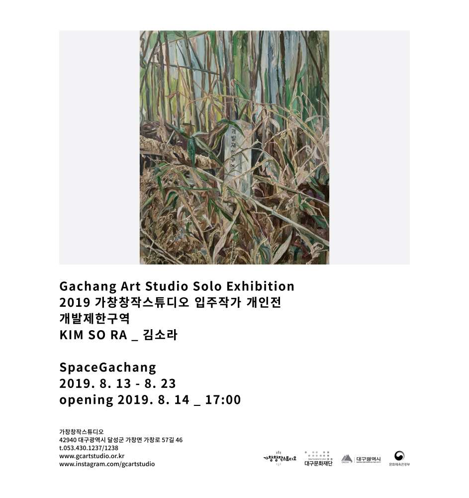 김소라 작가의 <개발제한구역>展은 작업실 주변을 산책하다가 개발제한구역으로 지정된 곳을 발견하여 그곳에서 채집한 이미지들을 회화로 기록한 작업을 선보이는 전시이다. 도시에서 나고 자란 그녀는 개발제한구역이라고 지정된 장소가 다소 낯설기도 하였고, 도시에서 볼 수 없는 풍경들을 발견할 수 있을 것 같은 설렘을 느꼈다고 한다. 하지만 도시경관을 정비하고, 환경을 보전한다는 명목 하에 개발제한구역은 작가의 생각과는 달리 관리가 전혀 되고 있지 않아 걷잡을 수 없이 자란 잡초들과 여기저기 뒤엉켜 버린 건초들이 방치된 풍경이었다. 작가는 이전 작업에서 보여주었던 무분별한 도시개발로 인하여 발생하게 되는 도시 이면의 버려진 것들에 주목하여 작업을 진행하였었는데 도시가 아닌 근교로 나와도 똑같이 방치된 것들이 존재하는 현상을 마주하게 되면서 그곳에서 발견되는 건초더미들과 죽은 나무들, 누군가가 버리고 간 쓰레기들이 이번 전시의 주요 소재로 등장한다. 이번 전시는 도시근교로 벗어나도 여전히 반복적으로 발생하는 개발과 방치의 공존 현상과 그것을 바라보는 작가의 내면의 감정들을 개발제한구역의 풍경에 투영시킨다.