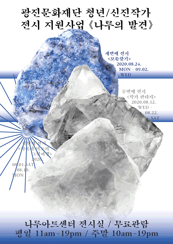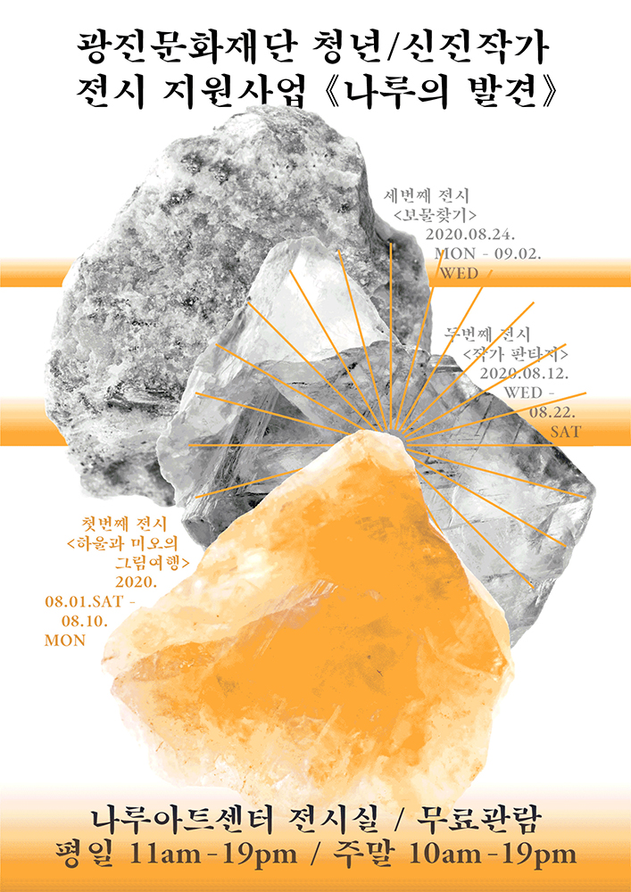 <나루의 발견>은 2020년 광진문화재단에서 신규로 추진한 시각 예술 분야 공모 프로그램으로 광진구 청년·신진 예술가를 대상으로 4월 한 달간 전시 공모를 진행했으며, <하울과 미오의 그림여행>, <작가 판타지>, <보물찾기> 전시가 선정되어 릴레이로 전시를 선보일 예정이다.