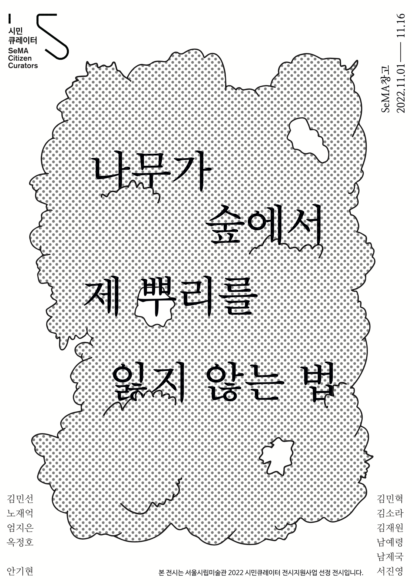 《나무가 숲에서 제 뿌리를 잃지 않는 법》 은 동시대에 공동체/시스템을 구성하는 개인은 어떤 형태를 띠고있는지 혹은 우리가 어떤 삶의 태도를 가질 수 있는지에 관한 탐구를 목표로 한다.