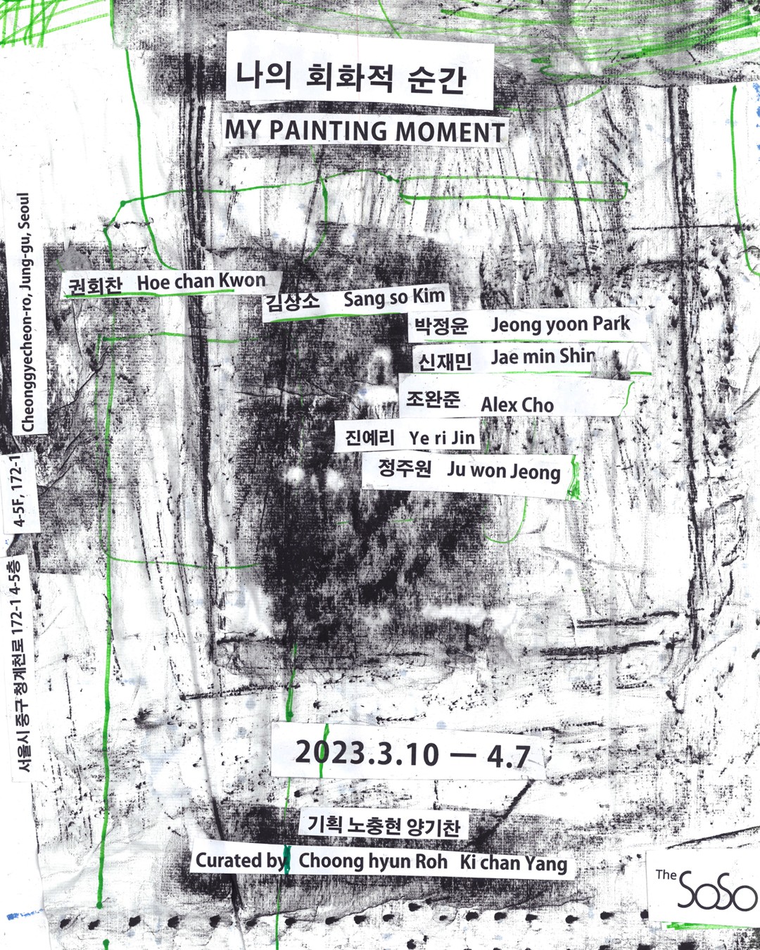 일전에, 시네마와는 다른 결의 러닝타임이 회화에서도 흐른다는 얘기를 진예리 작가에게 들은 적이 있었다. 비록 그 화면은 영상처럼 움직이지 않더라도, 들여다보지 않고는 찰나로만 목격할 수 없는 시간의 층위가 있다는 얘기가 흥미롭게 다가왔다. 보는 이에게는 순간적인 장면일지라도, 실제로 그 순간은 작가가 순간순간의 조형적 사유와 신중하면서도 과감한 획들로 층층이 쌓았을 표면일 테니 말이다. 그리고 이는 작가들마다 놓인 처지와 경험, 재료와 씨름하는 순간의 판단들에 따라 각기 다른 시간에 개별적으로 구현되어졌을 것이다. 이처럼 양식의 차이를 도래하는 창작의 과정은 회화가 단지 매체의 고유성만으로 규정하기도, 작가의 미학관만으로 특징 짓기 어렵다는 것을 상키 시켜준다. 왜냐하면 회화는 작가가 현존하는 순간들과 회화의 체계가 부딪히며 맞물릴 때, 독립적인 공간이자 존재로서 나타나기 때문이다. 이번 더 소소에서 진행되는 ‘나의 회화적 순간’展은 회화가 발생하고 완성되는 순간에 대한 자문으로부터 비롯되었다. 이와 같은 논의가 제기되었던 것은, 해당 전시의 참여작가들이 고정된 결과 값 보다는 창작 과정으로부터 회화의 형식을 발견하고 형성해 나가는 유사성이 있던 까닭이었다. 각자의 전략들에 따라 레퍼런스의 수집 및 작품 구상이 선행되었고, 그리는 방식들이 선택되었을 지라도, 그림은 예측에서 조금 빗기거나 벗어나 다른 모습으로 마무리되는 경우가 허다했다. 이들은 매순간의 그리기를 통해 회화의 흔적을 쫓으며, 화면 위를 유영하다 마주친 우연들을 나름 체계화함으로써 회화를 도출하는 순간을 맞이하였다.