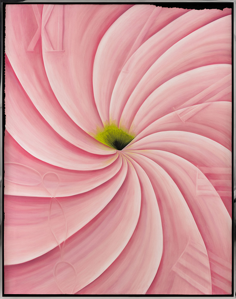 일련의 작품에서 유기체는 엔진의 해부학적 구조와 마주하며, 서로의 물리적 특성에 내재된 양면성을 드러낸다. 이 만남을 통해 기계의 근본적인 부드러움과 인간 및 식물 유기체의 기계적 특성이 동시에 나타난다. 터빈은 부드러운 그라데이션으로 표현되며, 시계 바늘은 꽃잎 속에서 거의 잠들어 있는 듯한 모습으로 물감층 사이에 희미하게 드러난다. 마치 눈꺼풀과 홍채처럼 묘사된 꽃은 전기 모터의 중심부를 연상시키며, 이러한 유사성은 우리가 무의식적으로 기술의 힘에 굴복하게 되는 일상적 행동의 자동화를 성찰하게 한다. 애크로이드의 작품에서 기계는 악의적인 존재가 아닌, 세심한 호기심으로 관찰되는 존재로, 어쩌면 기계와 우리의 미묘한 동일성을 더 깊이 이해하고 고찰하기 위한 시도로 보인다.