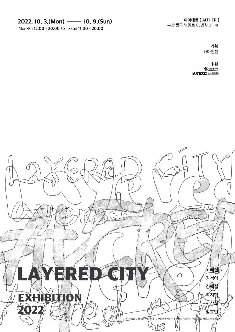 부산 지역 창작자 팀 ‘하마맨션’이 10월 3일부터 9일까지 아이테르(동구 범일로 65번길 21, 4층)에서 그룹전 ‘레이어드 시티: 도시 쌓기 프로젝트’를 진행한다. ‘레이어드 시티’는 부산광역시와 부산문화재단이 후원하는 전시로, 부산에서 활동하는 청년 예술가 6인이 부산을 수집하고 해체하여 다시 기록하는 아카이빙 프로젝트다.