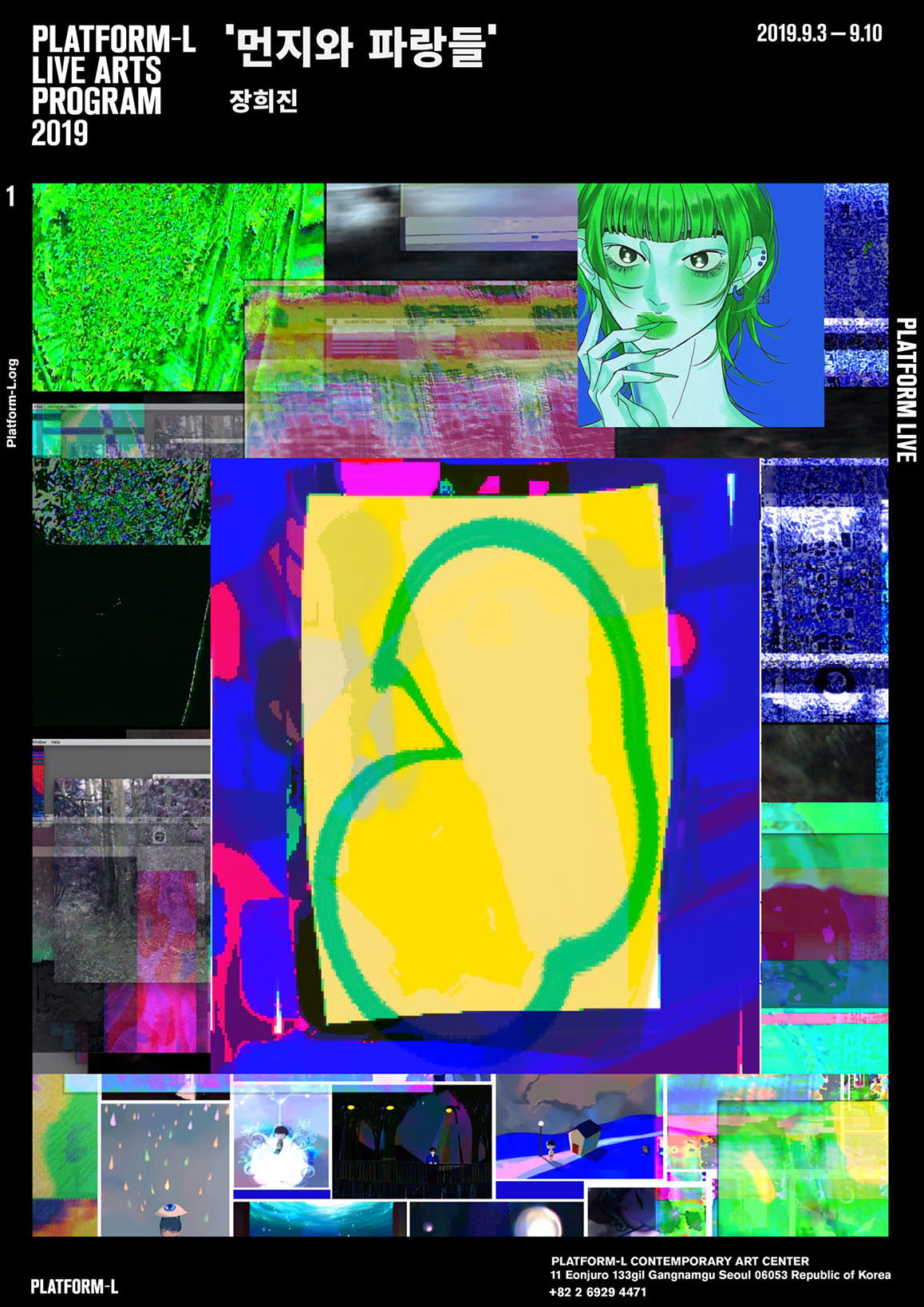 먼지와 파랑들 Dust, and Blues은 언어와 색채, 그리고 소리 사이의 관계성을 탐구하여 시간의 흐름과 맥락에 따라 끊임없이 변화하는 유기적이고 다층적인 구조로서의 체험을 만들어낸다. 하나의 언어와 색채로, 그 색이 다시 언어, 개인의 경험, 또는 집단의 상상력과 결합하여 전혀 다른 해석을 갖게 되는 순간들의 뒤엄킴을 영상 설치와 라이브 사운드 퍼포먼스의 형식으로 표현한다.