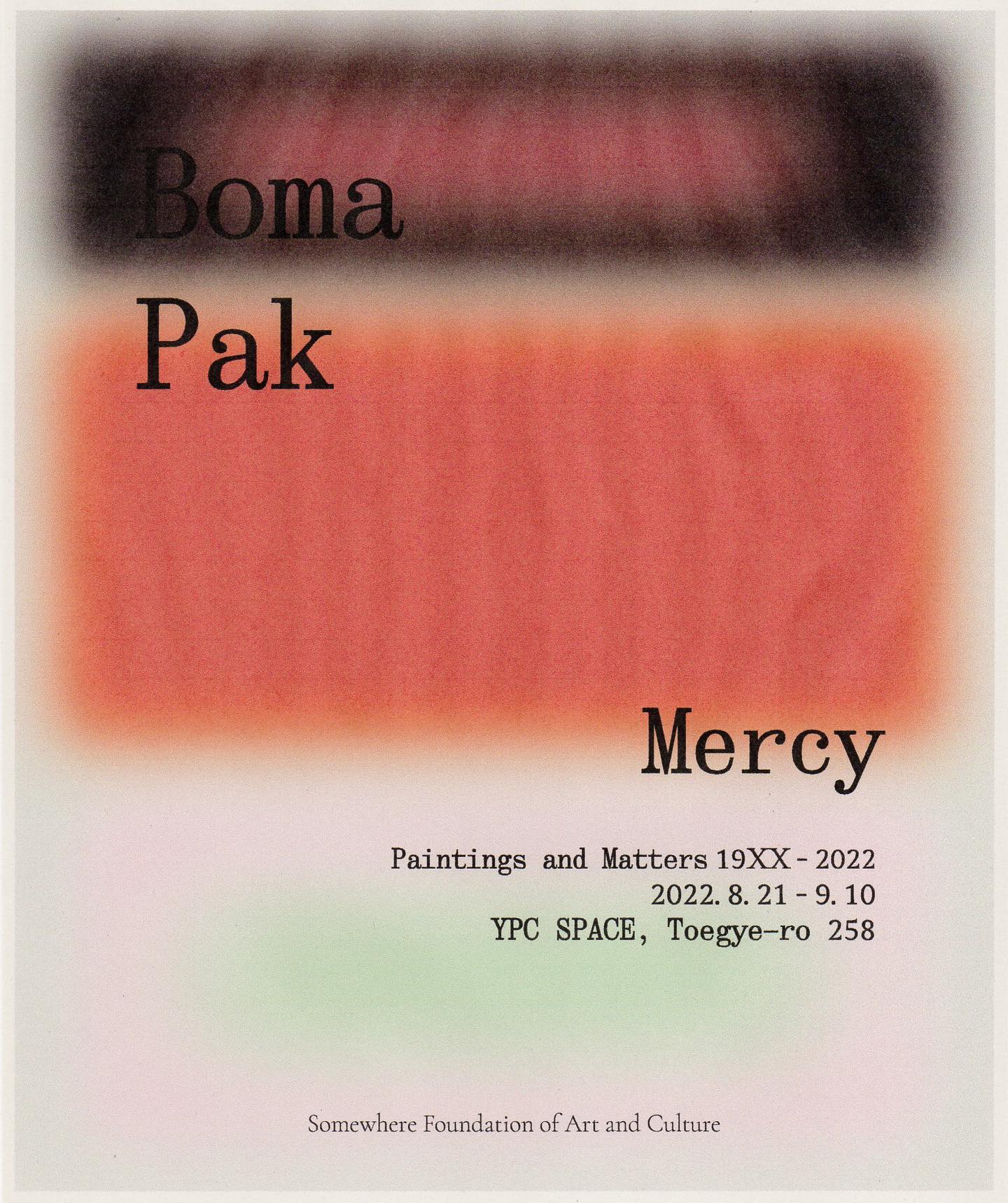 박보마 개인전 《자비: 페인팅과 물질들 19XX - 2022》는 미지의 화가 ‘박보마’라는 아이덴티티가 출현하는 장이자 작가의 회화 연작을 처음으로 다루는 전시다. 활동년도 미상의 아시아 여성 화가 '박보마'가 반복, 변주되는 색면 연작을 선보인다. 이는 찰나의 하늘 빛을 포착하여 스크린으로 보여주는 디지털 드로잉과 그것을 종이에 유화로 구현한 것이 본질적으로 다르지 않다는 깨달음, 즉 비물질과 물질의 극적인 화해가능성을 다룬다. 선과 색, 패턴과 반짝이는 물질로 구성된 평면은 찰나와 영원, 실재와 감정, 원형과 모방이 만나는 장으로 거듭난다.