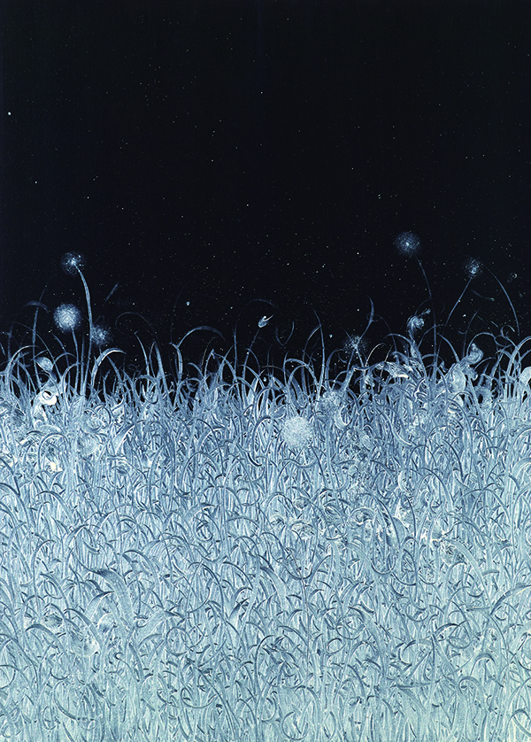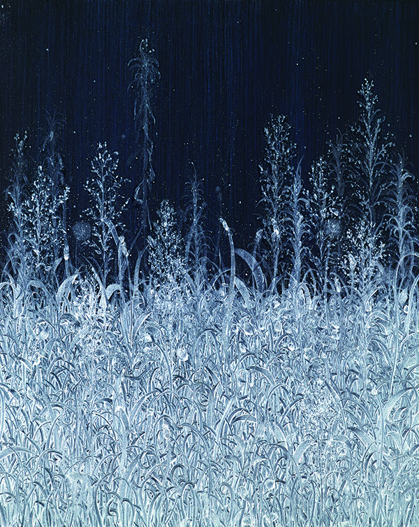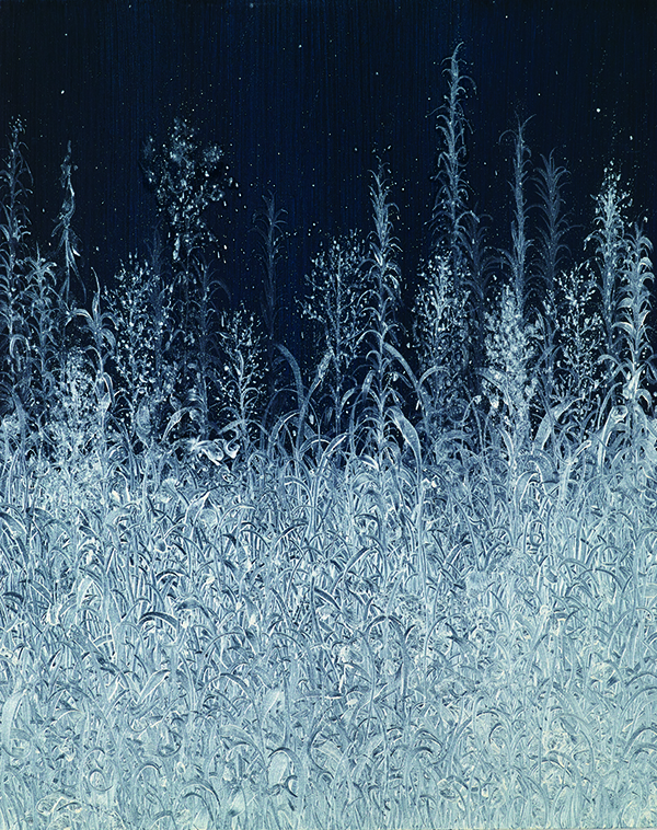 작품은 무성하게 자란 수풀인 동시에 도시의 모습을 담고 있다. 관객이 쉽게 기대할 수 있는 녹색의 자연이 아닌 도시의 야경과 허공을 찌르는 마천루의 실루엣이 보인다. 어둡고 차가운 색으로 칠해진 배경은 그 불투명함과 속도감이 느껴지는 붓질로 인해 도시의 칼바람처럼 작품 전체적인 분위기를 차갑고 비정하게 만든다. 강하게 드러나는 세로 방향의 획들은 갑자기 내리는 그다지 유쾌하지 않은 소나기처럼 화면을 가로지른다. 화면 하단을 빈틈없이 가득채운 식물들은 시각적으로 복잡하지만 모호하며 무심하게 묘사되어있어서 마치 포자로 이루어진 군집을 보는듯한 긴장감을 불러일으킨다. 개별 요소가 세밀하게 묘사된 것이 아니라 기계적으로 반복된 붓질들로 표현된 이미지는 오늘날 도심의 공허하게 떠도는 인간의 정체성을 보여준다. 강박적으로 가득 채워진 터치는 틈 사이로 드러나는 어둡고 푸른 배경과 더불어 교통체증처럼 도심의 공황이 느껴지게 한다.