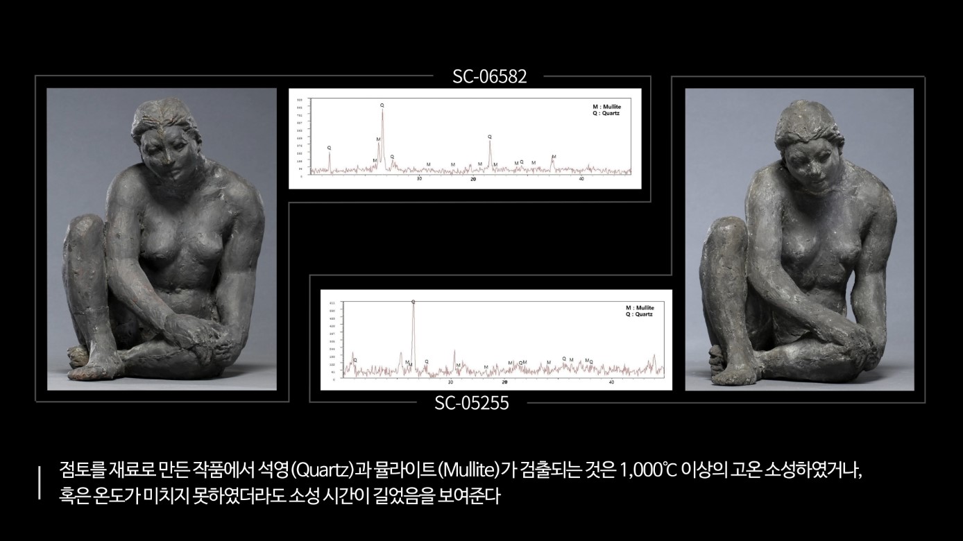 ‘C의 도구’ 공간에서는 이 외에 수백 종류의 안료와 현미경 등 광학기기, 분석자료 등이 함께 배치되어 보존과학자의 현실을 함께 보여준다. 특히 한국 근ㆍ현대 서양화단을 대표하는 구본웅(1906-1953)과 오지호(1905-1982)의 유화작품을 분석하여 1920~80년대 흰색 안료의 성분 변화를 추적한 분석 그래프와 제조사에 따라 물감의 화학적 특성이 다름을 시각화한 3차원 그래프는 보존과학에 있어 ‘과학’의 영역을 보여준다. 또한 자외선, 적외선, X선 등을 활용한 분석법을 통해 실제 우리 눈에 보이지 않는 그림 속 숨겨진 이미지를 확인할 수 있다. 특히 X선 조사법을 통해 구본웅의 1940년 작 〈여인〉에서는 집, 담장으로 추측되는 이미지가 발견되었고, 오지호의 1927년 작 〈풍경〉에서는 숨겨진 여인상을 확인할 수 있다.
