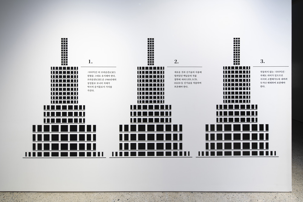 ‘C의 고민’에서는 작품을 보존·복원하는 과정 중에 보존과학자가 겪는 다양한 고민을 시각화 한다. 특히 TV를 표현 매체로 사용하는 뉴미디어 작품들의 복원 문제에서 새로운 기술과 장비의 수용 문제를 다룬다. 우종덕 작가는 최근 이슈가 되어온 백남준 作 《다다익선》(1988)의 복원 문제와 관련한 3가지 의견을 영상 설치 작품으로 소개한다. 한 명의 인물이 3개 채널로 나뉘어 각기 다른 의견을 이야기하는 영상은 한 사람의 보존과학자가 복원을 수행하기까지 고민하며 방향성을 찾아나가는 과정을 보여준다.