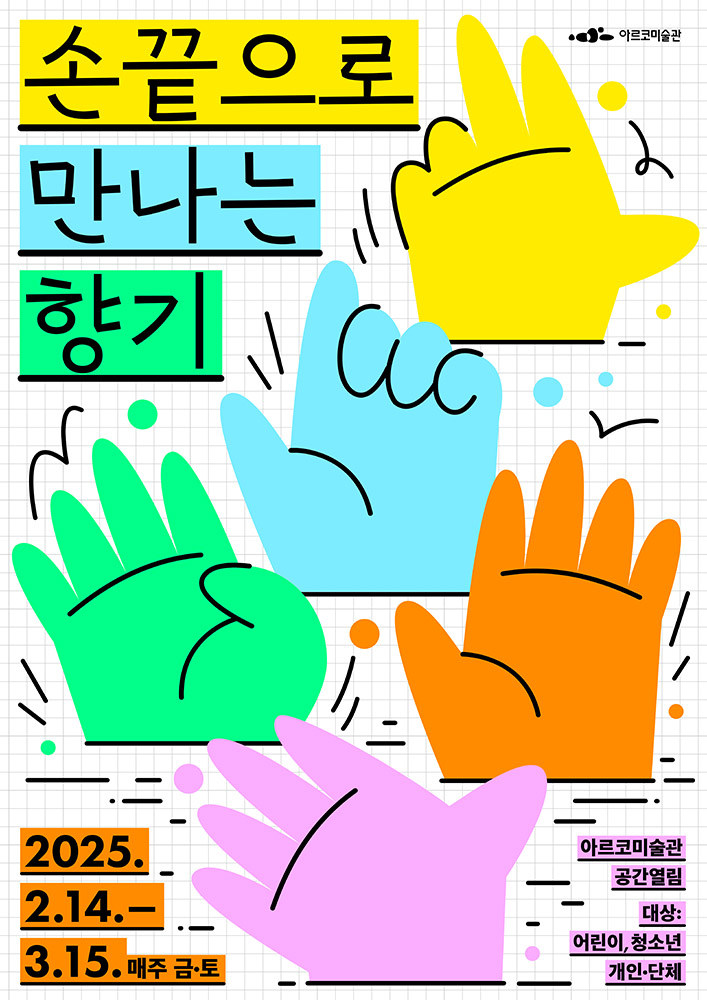 2025년 아르코미술관에서는 제 60회 베니스비엔날레 한국관 귀국전 《구정아–오도라마 시티》와 연계하여 어린이 대상 미술관 감상 교육 프로그램 <손끝으로 만나는 향기>를 진행합니다. <손끝으로 만나는 향기>에서는 후각과 시각을 공감각적 매체로 마련된 전시장에서 17개의 키워드를 가진 작품 속 향과 이야기를 감상하는 시간을 갖습니다. 참여 어린이는 기존의 전시 감상에서 벗어나 여러 가지 감각으로 미술관을 경험해 보고, 촉감을 활용한 조형 작품을 제작해 볼 수 있습니다.