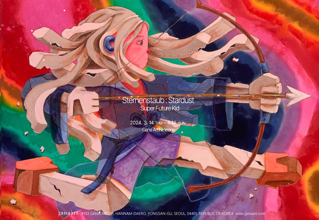 가나아트는 뉴욕 브루클린을 기반으로 활동하는 슈퍼 퓨처 키드(Super Future Kid, b. 1981-)의 개인전 《Sternenstaub : Stardust》를 개최한다. 베를린 장벽 붕괴 이전의 동독에서 태어난 슈퍼 퓨처 키드는 통일 이후 서독에서 유입된 비디오 게임, 음악, 초기 인터넷, 장난감과 같은 대중문화에서 영감을 받은 작업을 선보여 왔으며, 탕 컨템포러리 갤러리(Tang Contemporary Gallery, 홍콩, 베이징, 서울, 방콕), 오버 더 인플루언스(Over the Influence, 홍콩, 로스앤젤레스, 방콕, 파리), 쾨닉 갤러리(Koenig Galerie, 베를린, 멕시코 시티, 서울)와 같은 전 세계 유수 갤러리의 전시를 통해 소개된 바 있다. 본 전시는 한국에서 열리는 그녀의 첫 번째 개인전으로, 금이 가고 부서진 콘크리트의 몸을 가진 인간의 형상을 그려낸 7점의 신작을 조명하는 자리가 될 것이다.