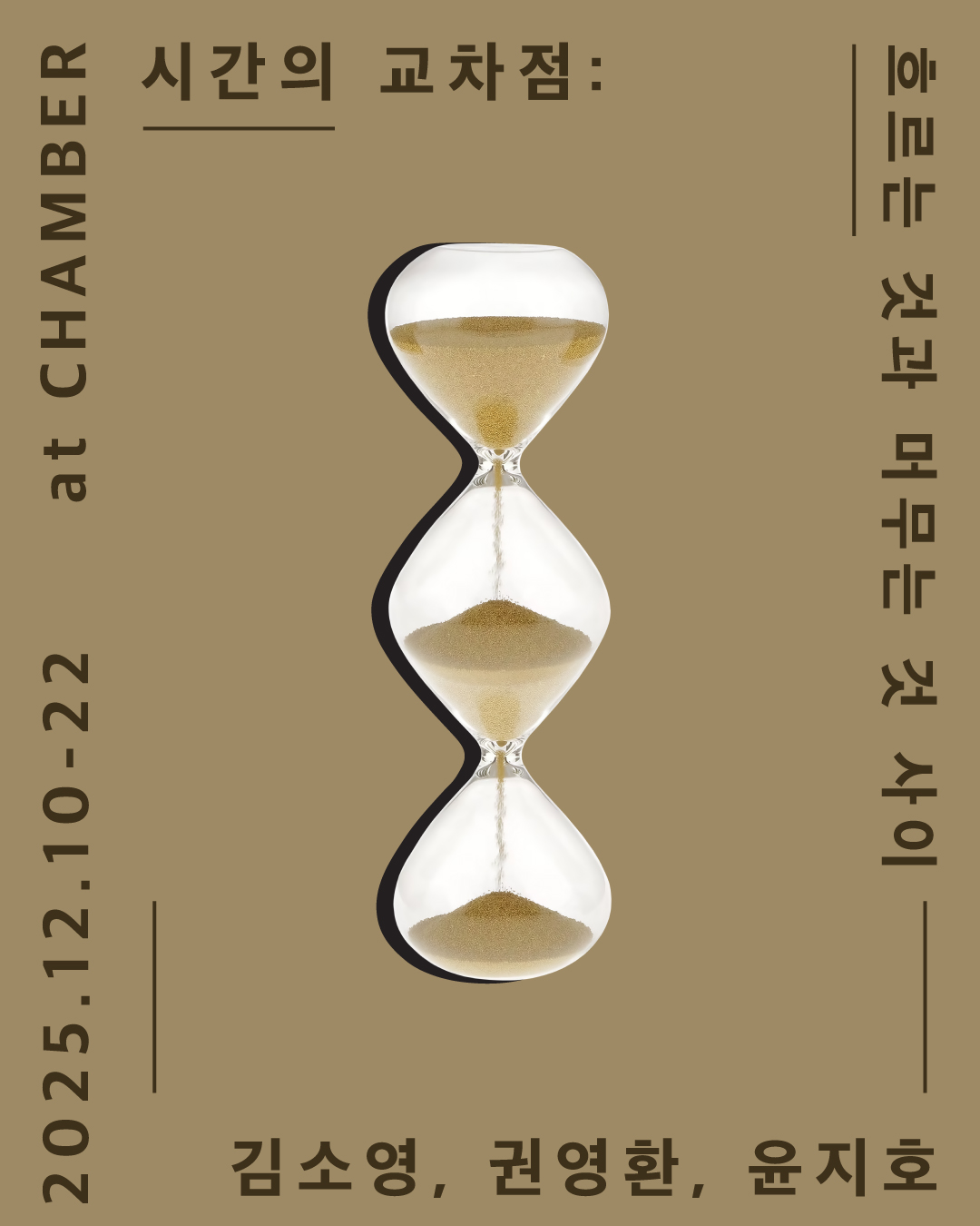 이번 전시는 세 작가의 시간성을 ‘하나의 시간 서사 안의 세 장면’으로 제시한다. 마치 삼각형의 세 꼭짓점처럼 김소영·권영환·윤지호는 크로노스와 성좌적 시간성, 그리고 그 사이의 전이 공간을 각기 다른 방식으로 구현한다. 시간의 축적을 관조하는 작업, 무너진 선형의 틈에서 파편을 엮는 작업, 그리고 ‘지금-여기’의 감각을 포착하는 작업. 세 작가의 작품을 통해 시간은 더 이상 흘러가는 흐름이 아니라 감각되고 재배열되며 사유되는 대상으로 다시 등장한다. 우리는 흩어진 시간의 파편을 붙잡아 새로운 가능성을 탐색하고, 그렇게 되풀이되는 현재의 구조를 서서히 돌파하게 된다.