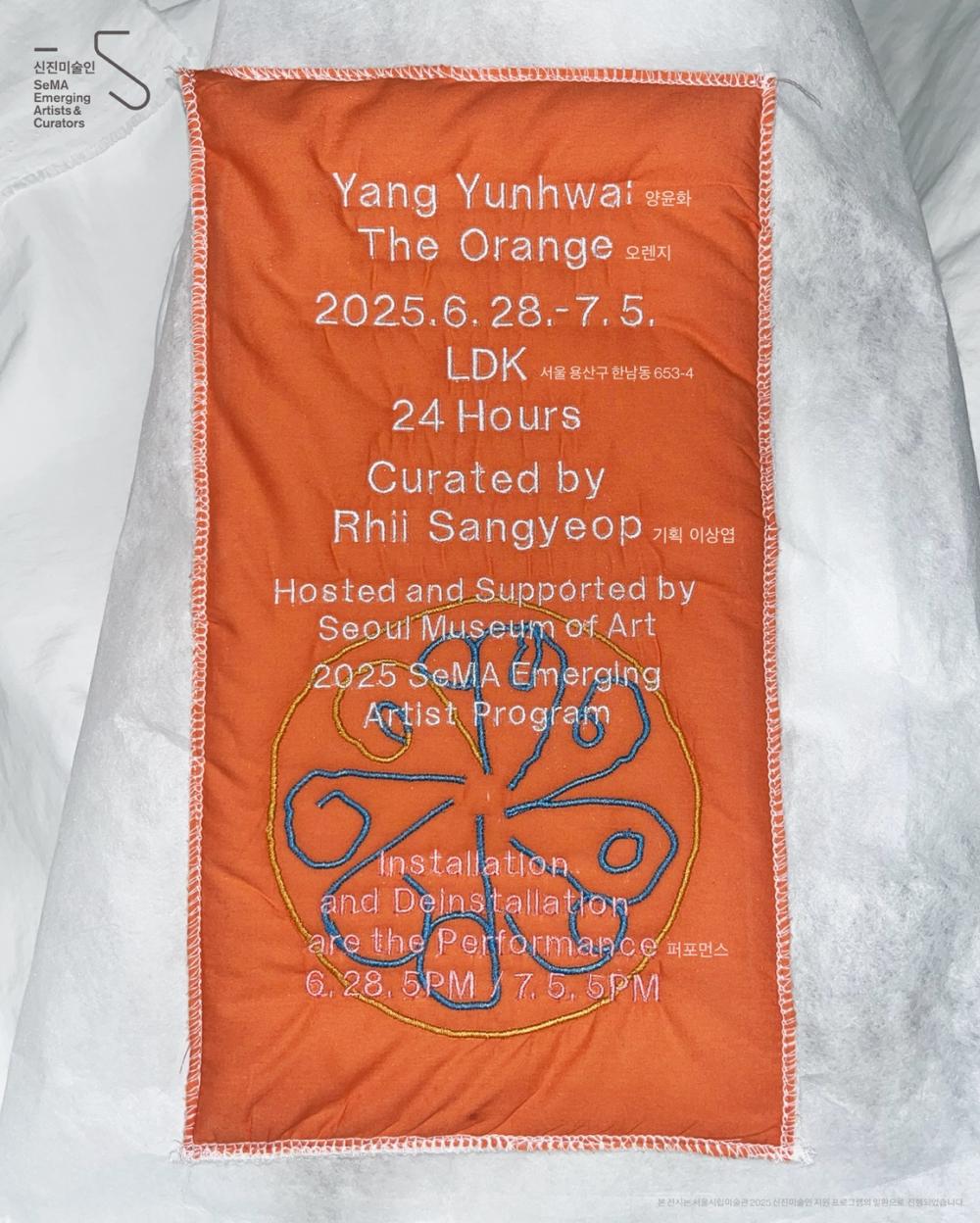 <2025 신진미술인 지원 프로그램>에 선정된 양윤화 작가의 개인전 《오렌지》는 ‘오렌지’를 경유한 작업의 이동과 향유의 이야기를 다룹니다. 작업이자 사물로서 동시에 존재하는 ‘오렌지’는 다음의 문장을 함께 나눠 가집니다. “오렌지의 가장 좋은 점은 들고 다닐 수 있다는 것이다. 그 다음으로 좋은 점은 나눠 먹을 수 있다는 것이다.” 양윤화는 신작 <The Orange>(2025)가 펼쳐지고 접히는, 등장하고 사라지는 작업의 설치/철수를 전시의 퍼포먼스로 선보입니다. 전시는 원형 시계의 분침이 두 바퀴 돌아서 만드는 24시간, 그로부터 생겨나는 두 개의 동그라미, 곧 두 개의 오렌지를 가리킵니다. 《오렌지》는 작업이자 사물로서 동시에 존재하는 ‘오렌지’와 그 너머를 감각하는 시공간이 되어 펼쳐집니다.