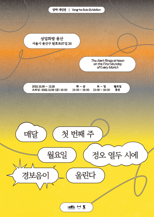 양하의 개인전 <매달 첫 번째 주 월요일 정오 열두 시에 경보음이 울린다>에서 우리는 어떤 이미지를 보게 될까? 작가 노트를 읽어보면 네덜란드에서 사람들은 불행을 준비하기 위한 시간을 가진다고 한다. 여기서 경보음이라는 소리도, 이미 감염이라는 팬데믹의 형태로 왔거나 아직 오지 않은 더 커다란 불행, 그리고 이 불행을 준비하는 시간도 비시각적이다. 비시각적인 요소들은 우리가 안전하게 지내고 싶어 하는 자리와 공간에 침입한다. 그것이 직접적인 위험이나 그 위험의 존재를 알리는 경우도 마찬가지다. 불행을 알리는 존재는 불행과 함께 순화하는 길을 따라간다. 닥친 일이 순간적으로 지나가듯, 관습처럼 자리잡힌 반복된 패턴 속에서 우리는 더는 경계하지 않게 된다. 그렇게 자연스럽게, 그저 흘러가는 것만큼 불행한 것도 없지 않을까. 작가가 그리는 이미지는 어렴풋하고 추상적일지도 모르지만, 아니 오히려 그런 특징에 형상화와 형식화, 전달과 망각(습관화)을 깨고 불행을 직시하도록 하는 힘이 있다.