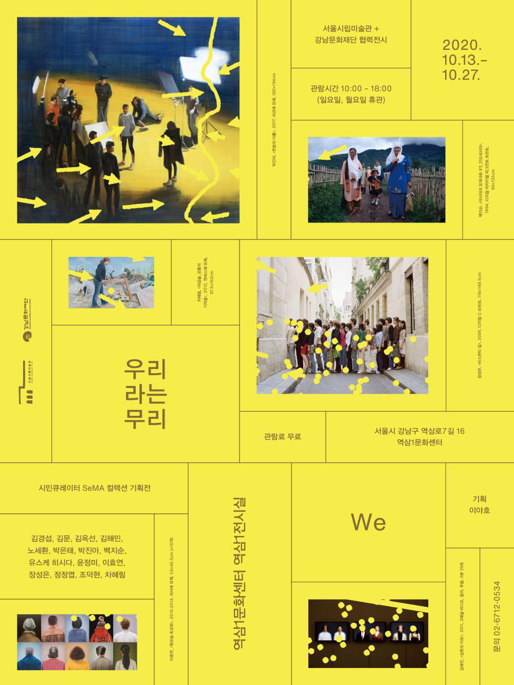 한국은 특히 언어에서 우리가 강조됩니다. 그만큼 한국인은 나만큼이나 상대와 다른 이를 고려하는 걸까요? 또 2020년 초 만들어진 강남구 스타일브랜드가 ‘미미위 강남(ME ME WE GANGNAM)’이기도 하니 역삼1문화센터 전시장에서 우리의 의미는 조금 더 특별합니다. 하지만 우리라는 말이 주는 따뜻하고 든든한 기분에도 불구하고, 현실에서 우리라는 범주는 차갑고 단단한 경계가 되어 바깥을 향해 질문과 공격, 폭력과 배척으로 작동하는 일도 흔합니다. 이 전시가 이런 위험을 감지하고 경계하는 계기가 되기를, 우리가 둘레를 넘어 장벽이 될 때 그 무게를 알아채고 살피는 기회가 될 수 있기를 기대합니다.