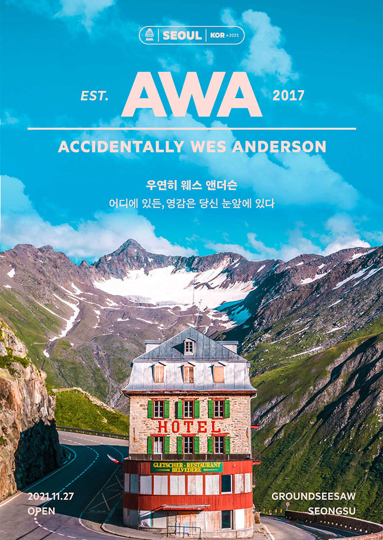 <우연히 웨스 앤더슨: 어디에 있든, 영감은 당신 눈앞에 있다>는 그라운드시소 성수에서 개최되는 여행 사진 커뮤니티 우연히 웨스 앤더슨 Accidentally Wes Anderson의 국내 첫 대규모 전시입니다. 유럽, 중앙아시아, 북미 등 전 세계 각지에서 수집된 웨스 앤더슨 스타일의 풍경사진 300여점을 회고, 여정, 영감 세 가지 테마로 나눠 선보입니다. 사각 프레임 속 동화 같은 장면과의 조우를 통해 새로운 여행에 대한 영감을 얻는 시간을 선사합니다.