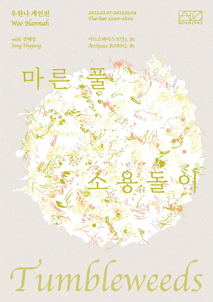 우한나의 개인전 《마른 풀 소용돌이》는 우리가 함께 여기에 서 있기를 기대한다. 뿌리없이 마른 풀이 도시와 국경을 넘어 다시 뿌리내릴 수 있게 하는 물과 바람처럼, 손에 잡히는 견고함 대신 무엇이든 되고 어디로든 갈 수 있는 유연하고 가벼운 존재가 마침내 소용돌이를 일으키며 등장하는 순간, 서로가 서로의 목격자가 되어주기를 바란다.