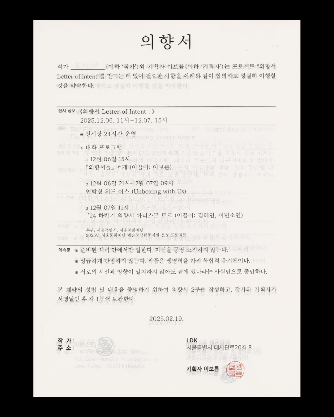 “의향서 Letter of Intent”(2024–)의 참여자들이 새로운 장소로 이동합니다. 올해는 정원이 딸린 아늑한 주택에 잠시 정박합니다. 원하는 만큼 머물고 눕고 쉬면서 우정을 떠들어 봅시다: 의향서와 Letter of Intent, 큐레이터와 작가, 전시와 관객, 아카이브와 매뉴얼, 출판과 독자, 세운상가와 LDK, 번역과 오역, 환상과 허명, 저주와 돌봄, 기만과 위선, 지원금 있/없 (계속) 친구, 연인, 가족, 동료, 동료 아닌 사람, 그저 지나가던 이, 잠깐 쉴 곳이 필요한 분, 강아지, 고양이, 까치, 비둘기, 바람, 낙엽, 먼지, 정령—모두 환영합니다. 이건 당신을 만나기 위한 핑계일 뿐이니깐요.