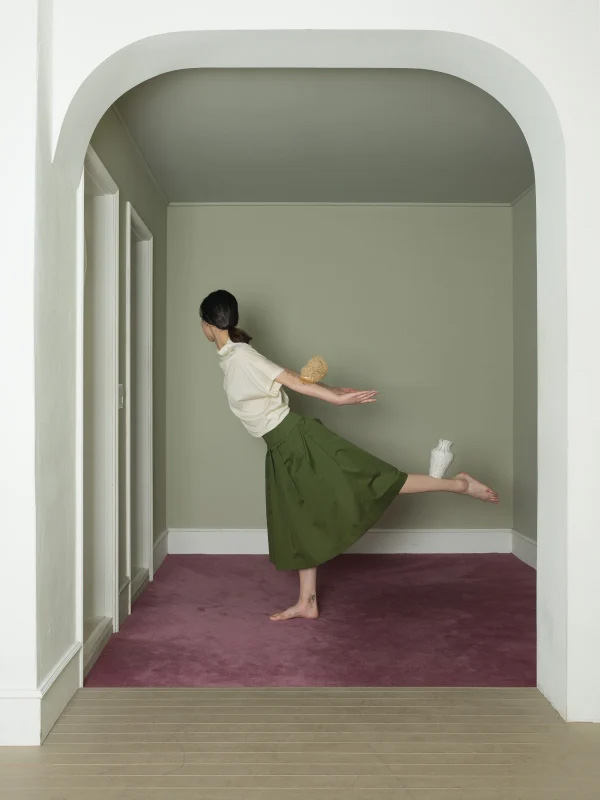 2019년도에 작가는 ‘인간–오브제–풍경’을 동등한 존재로서 다루며 사물화된 대상의 장면을 연출하는 시도를 했다. 이들 중 작품<리듬C, 2019>는 조형성과 색감의 회화적 감각이 돋보이는데, 특정 공간을 무대화 하여 테이블이 된 신체와 오브제, 배경 간의 관계를 조화롭게 드러내며 긴장된 감정과 안정감을 동시에 만들어낸다.