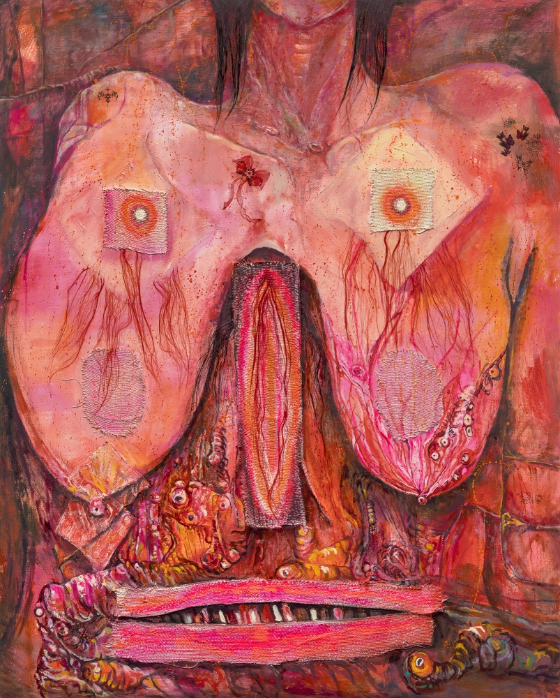 K2 전시장에서 장파는 여성의 신체가 다루어지는 방식에 관심을 갖고, 역사 속 여성 재현의 이미지뿐 아니라 인터넷에서 발견한 동시대의 여성혐오 이미지, 에밀리 디킨슨(Emily Dickinson, 1830–1886)의 시구 등을 실크스크린 기법으로 캔버스에 전사한 후 파편화된 신체, 내장, 눈과 입술 같은 ‘구멍’의 이미지와 병치한다. 이처럼 회화적 순수성과 장식성 사이의 혼종성을 적극적으로 포용하는 작가의 전략은 냉소적 유희를 불러일으키며, 시각적 위계와 질서를 일시적으로 붕괴시켜 비판적 층위를 형성한다. 여기서 ‘몸’은 단순히 고통의 대상에 머물지 않고, 그 흔적을 발판 삼아 감각적 전복을 수행하는 주체로 재구성된다. 회화 속의 상처는 응시를 요구하고, 분절된 육체는 우스꽝스러울 만큼 과장되며, 고통은 정념적 진지함에 포획되기보다 조롱과 유희의 형식으로 비틀린다. 이러한 웃음은 단순한 위안 혹은 해학이 아니라 제도화된 미적 감수성과 윤리적 판단을 교란시키는 수단으로 작동한다.