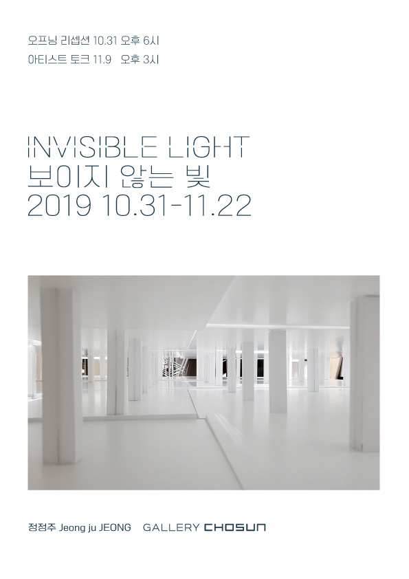 갤러리조선은 2019년 10월 31일부터 11월 22일까지 정정주 작가의 개인전 <보이지 않는 빛 Invisible Light>을 개최합니다. 정정주 작가는 20년 남짓 쌓여온 자신의 작업 세계를 통해 공간, 기억, 응시, 타자 등의 주제를 탐구해왔습니다. 모형 건축물을 만들고 그 안에 카메라를 설치하여 공허한 응시를 시각화하거나 바라봄의 주체와 객체의 관계를 역전시키는 것이 작가의 기존 작업의 주된 한 축을 이뤘다면, 최근에 작가는 3D 애니메이션 영상 작업이나 스테인레스, 플라스틱 등의 재료를 활용한 조각 작품으로 기존 관심의 다양한 변주를 만들어왔습니다. 이번 전시에서 작가는 자기 작업 세계의 과거와 현재를 연결하고 종합하는 시도를 선보입니다.