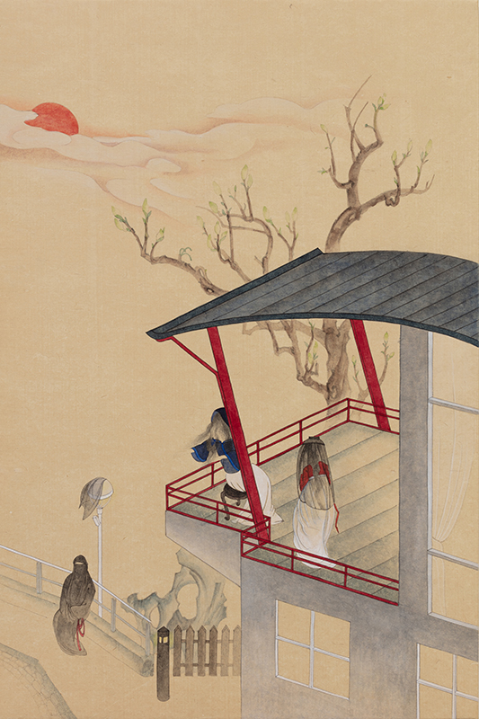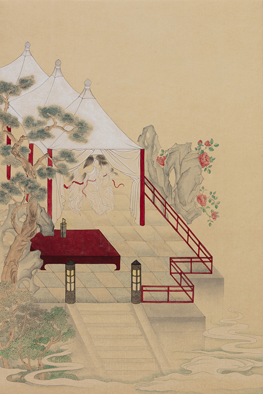 계절의 흐름에 따라 기승전결의 구도를 갖춘 이번 전시에서 정해나는 사건의 장면마다 그림을 그려 시각 이미지로 구현한다. 특히 〈연회장의 밤〉 연작에서는 실재하는 창작스튜디오의 현대적 건물을 배경으로 옛 그림에서 나올 법한 짙은 안개와 영롱한 구름, 기암괴석과 하늘거리는 여인의 옷차림 등이 중첩되어 몽환적인 시공간으로 연출된다. 마치 옛이야기를 담은 『요재지이』나 『아라비안나이트』를 눈으로 보는 듯 우화적이고 전설적인 묘사로, 작가는 이를 위하여 먹과 호분 등과 같은 재료뿐만 아니라 연회도, 기명절지도, 사녀도 등 동양 전통화의 양식을 차용하였다.