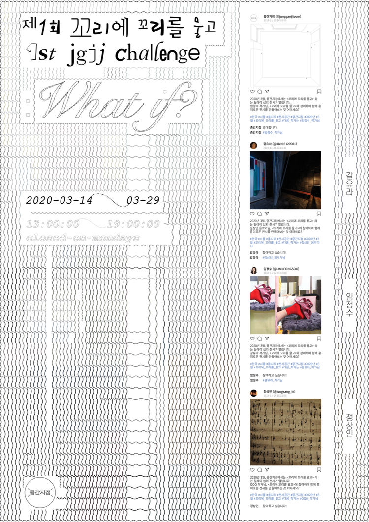 <제1회 꼬리에 꼬리를 물고: what if?>는 중간지점이 지목한 한 작가가 다음 한 명의 작가를 추천하고, 그 한 명의 작가가 또 다른 한 작가를 지목하는 방식으로 구성된 프로젝트이다. SNS 상에서 릴레이로 진행되는 챌린지에서 섭외 형식을 착안하였다.