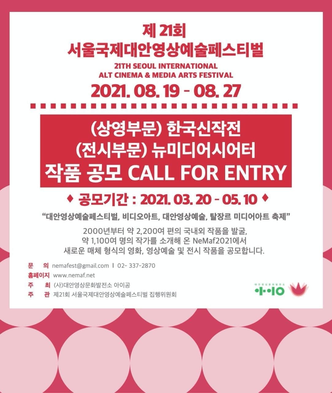 사)대안영상문화발전소아이공이 주최하는 서울국제대안영상예술페스티벌(NeMaf2021)에서 새로운 매체 형식의 영화,영상예술 및 전시 작품을 공모합니다. 서울국제대안영상예술페스티벌은 지난 20여년간 영상예술의 분야에서 상영 부문 한국신작전(구: 한국구애전)과 전시 부문 뉴미디어시어터(구 전시구애전)를 위한 작품을 공모하여 왔습니다. 뉴미디어시어터 프로그램은 탈영역우정국, 미디어극장 아이공, 서교예술실험센터, 아트스페이스 오 등에서 개최되었습니다. 많은 관심과 출품을 부탁드립니다.