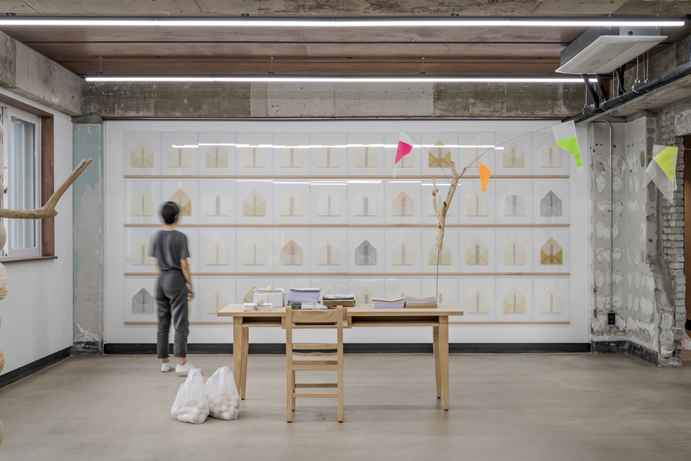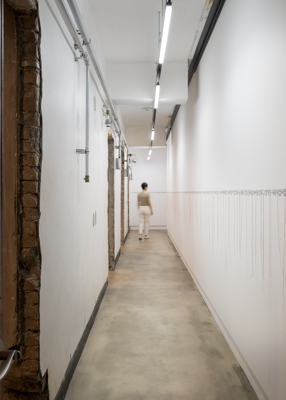 아트센터 예술의 시간은 서울시 독산동 공장지대의 ㈜영일프레시젼 기숙사였고, 노동자들이 살았던 원룸이었다. 40년을 살아 온 이 장소의 내력은 완전히 사라지지 않았다. 방을 트고 벽의 피부를 벗겨서 예술의 시간을 담는 그릇으로 탈바꿈 시킬 때 오래된 골조는 이 그릇의 민낯으로 다시 태어났다. 시간의 켜를 키질해 놓은 듯 군데군데 남아있는 벽의 여러 흔적들은 어떤 미술과도 교집합을 이룰 것만 같은 추상성을 가졌고, 헝클어진 검불을 까부르고 난 뒤의 알갱이처럼 공간은 뚜렷하고 선명한 윤곽선을 그리며 낮게, 조용히 침잠해 있었다.