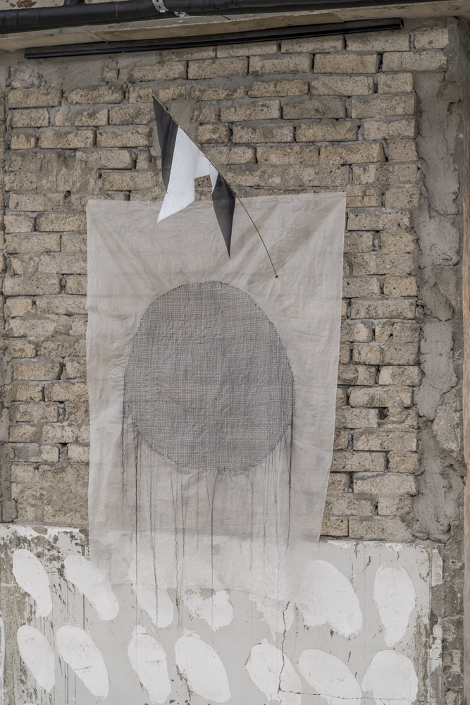 <대충 그린 원>은 두 작품인데, <내가 하는 일>이 공간에 서서 벽에 붙은 그 두 개의 원을 보는 양상이다. 어쩌면 세 작품은 삼각의 구도를 그리면서 완성되는 ‘3수 세계관’의 한 상징이라는 생각도 든다. ‘삼위일체(三位一體)’처럼 하나이면서 셋이고 셋이면서 하나인 철학적 원리. 그 조화의 원리를 담은 경전이 『천부경(天符經)』이다. 총 81자로 되어 있는 이 경전의 첫 문장은 “일시무시일석삼극무진본(一始無始一析三極無盡本)”인데 그것의 해석은 “모든 것은 하나에서 시작되나 그 하나는 시작이 없고, 하나가 나뉘어 셋이 되지만 그 다함이 없는 근본은 그대로다.”7)라는 뜻이다. <내가 하는 일>을 삼각구도에서 빼면, 두 작품은 마치 음과 양처럼 하나의 쌍이요, 두 개의 한 원리여서 그 자체로는 각각 무극(無極)이고 또 태극(太極)일 수도 있는 그런 작품이기도 하다. 『천부경』의 마지막 문장은 “모든 것이 하나로 끝나되, 그 하나는 끝이 없다.”이다. 비단에 실크실로 둥근 그물을 박음질한 작품이 ‘시(始:처음)’와 ‘종(終:끝)’ 사이의 ‘숨줄’이라면, 색연필로 먹칠해 놓은 작품은 처음이거나 끝일 것이다. 그것이 곧 ‘끄트머리’다. 끝이 곧 처음이라는, 아니 끝과 처음은 둘로 나눌 있는 게 아니라는 이야기. 하나라는 이야기.