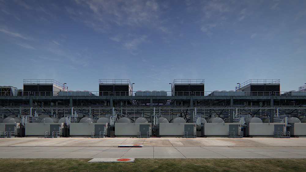 아일랜드 작가 존 제라드의 <농장(카운슬 블러프, 아이오와)>(2015)은 시뮬레이션 작품입니다. 게임 엔진을 기반으로 3D 리얼 타임 컴퓨터 그래픽을 이용하여 제작한 이 작품은 인터넷 검색 엔진을 대표하는 구글 데이터 센터의 모습을 시뮬레이션하고 있습니다. 느린 속도로 펼쳐지는 화면은 센터의 모습을 하나씩 드러냅니다. 한 켠에는 디젤 발전기가 돌아가고 다른 한 쪽에는 거대한 쿨링 시스템이 갖춰져 있습니다. 화면 속 시간은 미국 아이오와 주의 표준 시간대를 적용하여, 그곳의 낮과 밤을 보여줍니다.