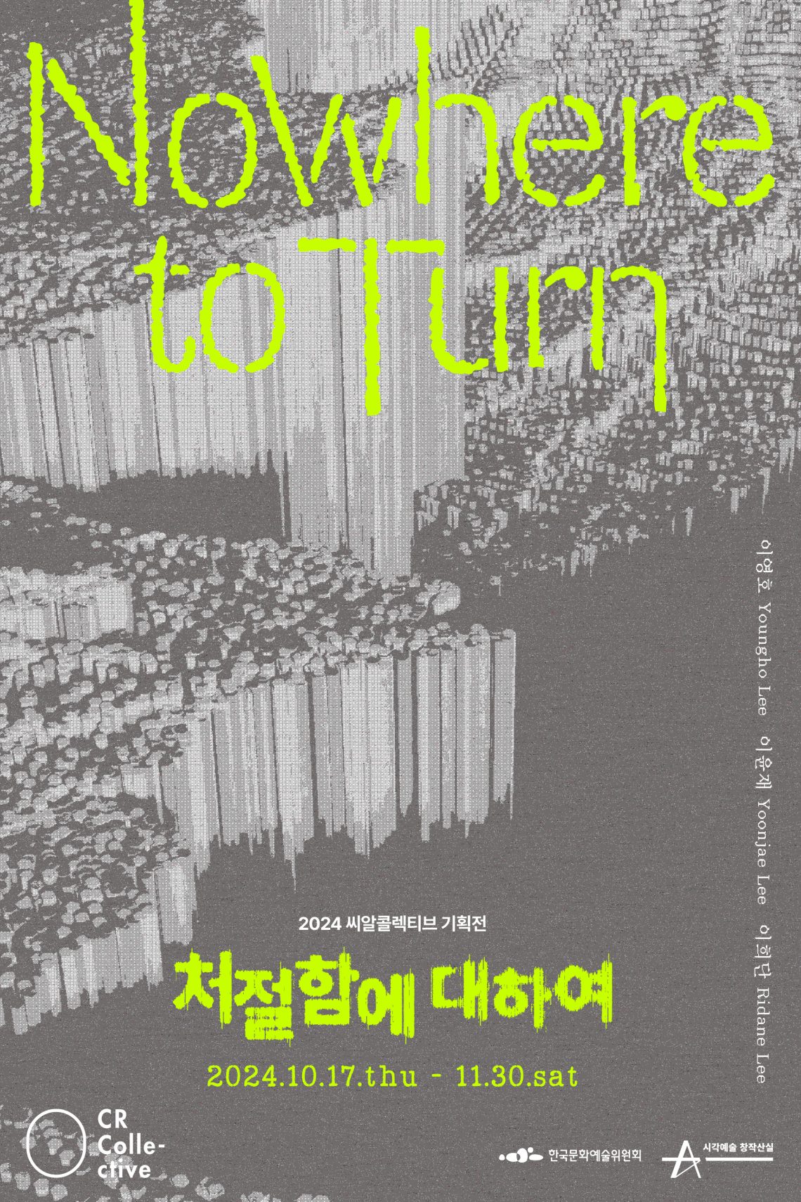 CR Collective씨알콜렉티브는 2024년 마지막 전시로 씨알콜렉티브 기획전 ≪처절함에 대하여 Nowhere to Turn≫을 2024.10.17(목) – 11.30(토)까지 개최합니다.