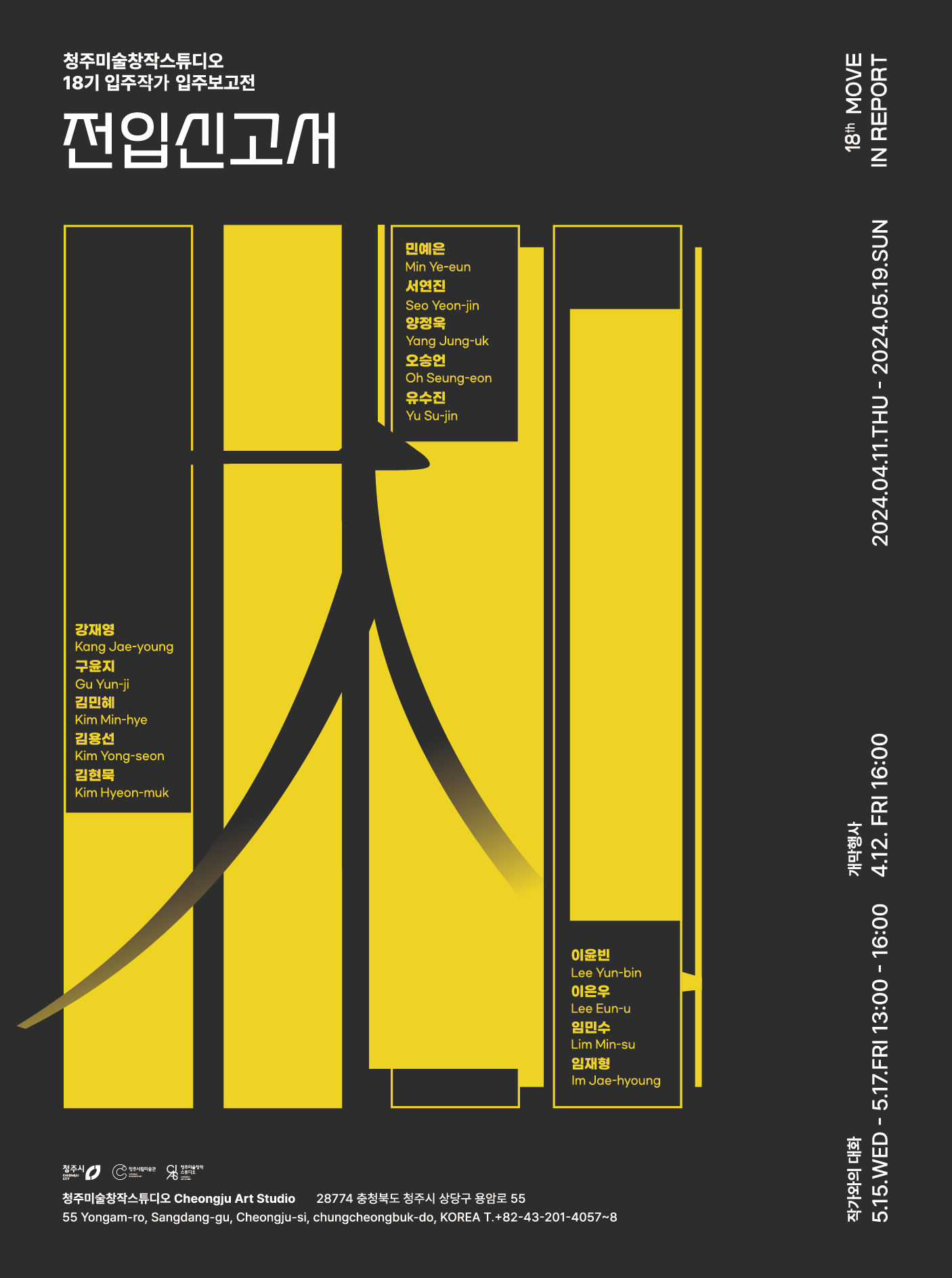 창작스튜디오 18기 입주작가로 선정한 14인은 2023년부터 진행한 레지던시 공모를 통해 전문 심사를 거쳐 2024년 3월에 입주하였다. 《18th 전입신고서》는 청주미술창작스튜디오의 입주 공간으로 전입한 18기 작가들의 시작을 신고한다.