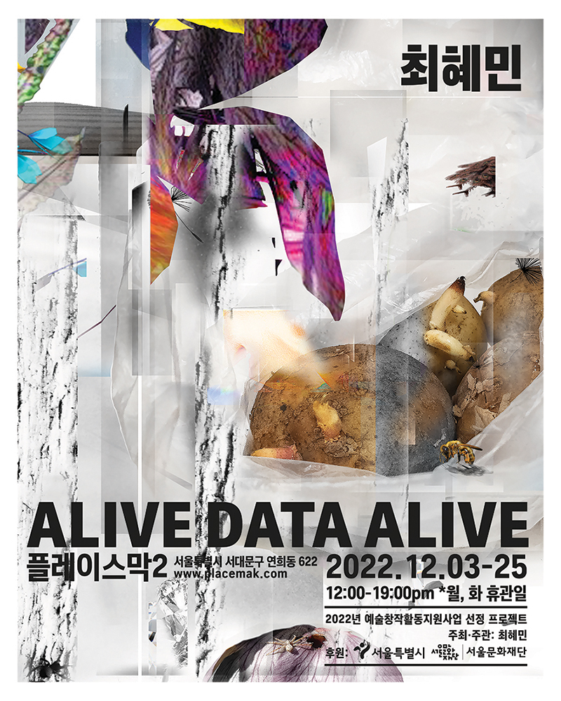 최혜민의 작품은 이미지의 무덤인지도 모르겠다. 분절되어 있지만 느슨하게 연결된 이미지를 ⎯구색 맞추기 위해 다시 찾지 않는다는 지점에서⎯ 현실을 망각한 자신에 대한 순종적 태도로 ⎯그림을 그리듯 자르고 붙인다는 지점에서⎯ 한곳에 묻어버린 무덤 말이다. 끝을 알 수 없는 데이터의 우주에서 그녀의 순간이 건저올린 이미지는 생기가 있거나 생기가 없기 때문에 더 그렇게 여겨지는지 모른다. 언제 찍었는지 알 수 없는 빙하 영상이 그러하듯 이미지는 살아있지만 그 실제는 어디에도 존재하지 않는다. 망각을 위해 자발적으로 선택한 쾌감은 우리를 무감하게 만든다. 기념일이 되어도 작은 감흥조차 느끼지 못하는 것처럼 말이다. 현실을 놓쳐버린 데이터의 무덤은 역설적이게도 살아있다는 감각을 일깨운다. 누군가의 죽음 옆에서 애도할 때 애도하는 생명이 증명되듯이. 연상하는 대로, 아주 가벼운 사유로부터 얻어낸, 밀도 있는 이미지는 그것을 처음 만나게 했던 키워드를 무색하게 하는 아리송한 정물 사진으로 남았다. 중앙을 차지하지만 바짝 말라버린 엉겅퀴와 작품 한구석에 자리한 올챙이 이슬에서 눈치챌 수 있는 최혜민의 직관적 연상은 작품 여기저기에 사유의 웅덩이를 파 두었다. 범람하는 데이터의 시대에 흩어지고 몰리면서, 공개되거나 가려지는, 거룩하거나 하찮게 회자되는 모두의 죽음과 삶을 비유할 수 있도록.