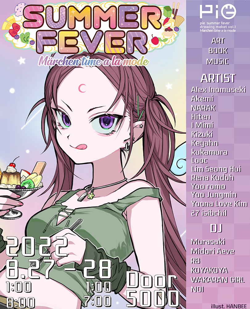 《 파이☆썸머☆피버》는 캐릭터 아트와 서브컬처를 방법론으로 작업을 해 나가는 한국과 해외의 작가를 초청하여 드로잉, 서적, 굿즈 판매를 하는 마켓,파티 행사입니다. 방문객들이 부담스럽지 않은 가격대로 작품을 컬렉팅하고 서브컬쳐의 여러 컨텐츠를 편하게 즐길 수 있는 행사를 만들고자 합니다.