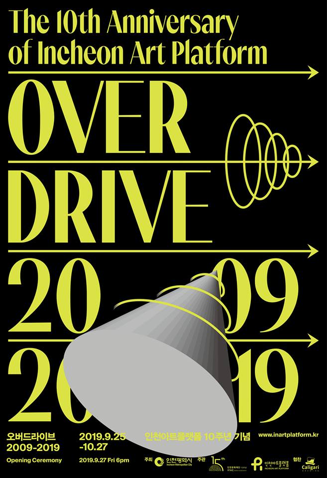 인천아트플랫폼 10주년 기념사업 ‘오버드라이브 2009-2019’는 기념행사와 국제심포지움, 전시, 시민참여 이벤트, 2019년 입주작가 오픈스튜디오 등으로 구성되었습니다. 행사 주제인 ‘오버드라이브(Overdrive)’는 시동장치를 증속(增速) 시키는 장치를 일컫는 말로 증속하는 행위에 담긴 급진적인 정신을 예술에 접목하여 인천아트플랫폼의 새로운 변화 에너지, 역동적 비전을 제시하고자 합니다. 기념전시인 《오버드라이브 2009~2019 : 여행하는 주체들, 창조자, 장소의 경험》은 주제를 담은 시각예술 작품 전시인 ‘광장에서’와 ‘제안하기’, 인천아트플랫폼 인근 예술가들의 활동은 조명하는 ‘확장하기’, 아카이브 전시인 ‘기록하기’와 건축적 의의를 담은 ‘장소의 경험’으로 구성됩니다.