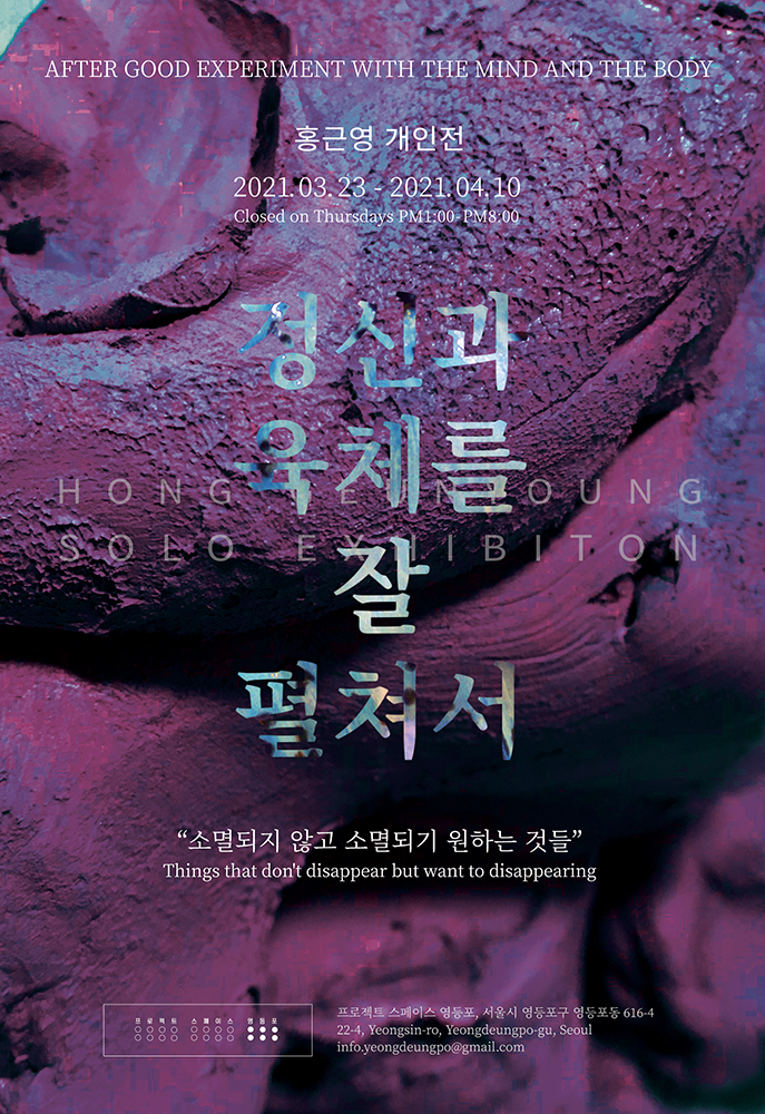 프로젝트 스페이스 영등포는 2021년 3월 23일부터 4월 10일까지 홍근영작가의 개인전, “정신과 육체를 잘 펼쳐서, 소멸되지 않고 소멸되기 원하는 것들” 을 개최한다.