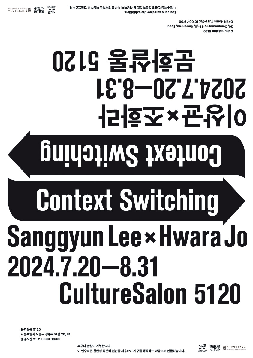 ‘Context Switching’(문맥 교환)은 CPU가 하나의 프로세스를 실행하고 있는 상태에서 다른 프로세스가 CPU를 사용하기 위해 이전 프로세스의 상태(문맥)를 보관하고 새로운 프로세스를 시작하게 하는 조작을 의미하는 프로그래밍 용어입니다. 이 전시 제목은 오랜 시간 협업 관계를 유지해 온 두 명의 창작자 이상균(조형예술가), 조화라(그래픽 디자이너)가 이번 전시에서 각자의 역할을 역전시키거나 서로의 형식을 교환하는 작업의 방식을 비유적으로 나타냅니다.