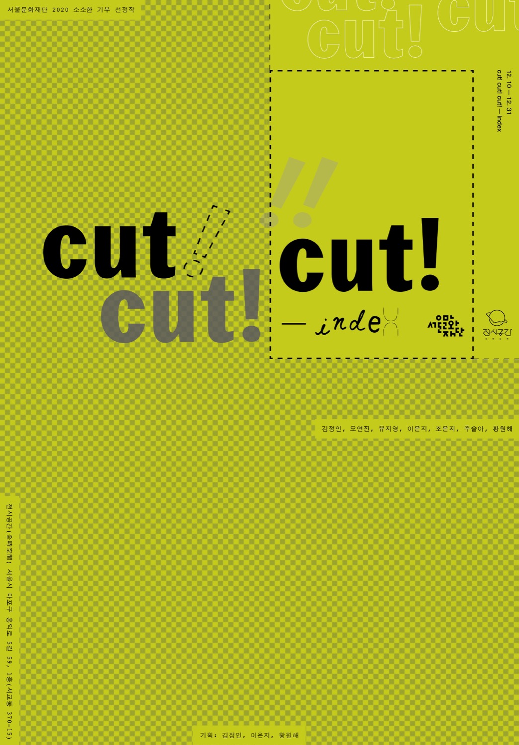 공간에서 지면으로 지면에서 웹으로 웹에서 공간으로 옮겨가는 전시 과정에서 덧붙여지거나, 잘리거나, 증식된 이미지들은 작업의 실마리와 같은 지표가 된다. cut! cut! cut! — index 는 공간, 웹, 지면이라는 제약과 규칙성을 결합하여 작가들의 단서를 한데 모아둔 전시이다.