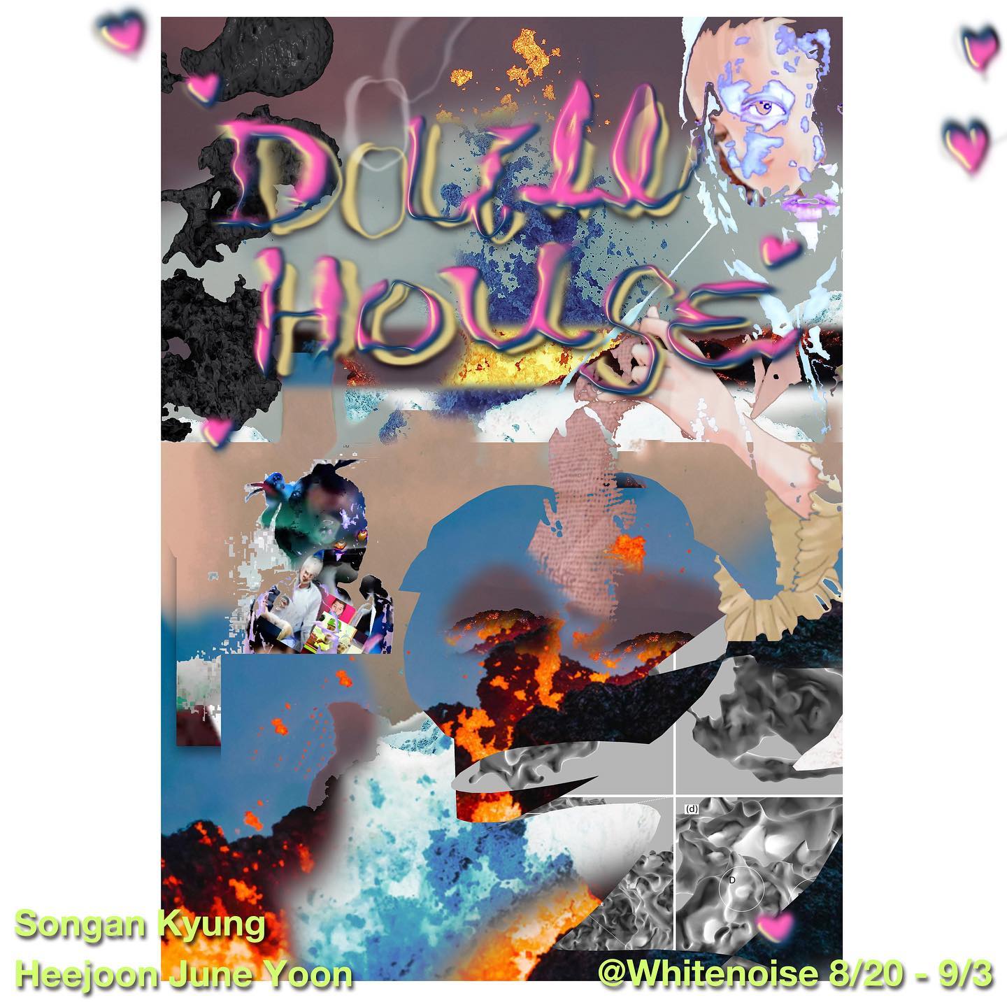 이번 전시, <DØULL HOUSE> 에서 경송안의 가상의 미제사건 수사 <공중화장실 미스테리 폭발사건>과 윤희준의 디지털세계에서 유포되는 여성이미지에 세뇌된 <미미>는 배경과 인물로서 상호작용하며 하나의 내러티브를 형성하고 전시장 전체를 무대로 만든다. 그에 따라 입장하는 관객에게는 내러티브 속 역할에 대한 몇 가지의 선택권에 주어진다. 미미, 가해자, 피해자, 목격자, 수사관 등 여러 옵션 중 관객은 자신의 경험에 근거하여 스스로가 더욱 이 현장에 이입할 수 있는 캐릭터로 동기화해 작가들이 지은 인형의 집 속 역할극의 일원이 된다. 하지만 가상의 세계에 대해 인식과 이질감이 흐려지고 관객에게 낯설지 않은, 익숙한 이야기가 되는 순간부터 공간은 ‘지루한, 따분한 집’ 으로 뒤바뀐다. 믿을 수 없이 잦은 빈도로 뉴스에 등장하는 성범죄 사건은 복원되고 잊혀지고 재발하기를 반복하며 소리없이 타인의 고통에 공감하기 위한 기준은 상향평준화되었다. 더불어 사건은 자극적일수록 값어치 있는 재화로 여겨지며 사건의 당사자들을 맥락에서 지워버린 채 갖은 방법으로 정치체제와 자본주의의 아귀 속에 던져진다. 여성 성범죄 사건과 위협의 일상・상업화, 그에 따른 대중과 사회의 내외부적 반응의 사막화, 젠더이슈의 소재적 사용에 대한 자기회의, 그럼에도 끊임없이 언급할 수밖에 없고 또 해야만하는 작금의 현실까지. 이러한 사태는 안정과 편안함을 내포하는 보편적 의미의 ‘집’을 상실하고 가장 미시적인 단위에서부터 가장 광범위한 의미의 ‘집’ 까지를 무대로 벌어지고 있다. 두 작가는 그들이 세운 가상 세계를 사회 모듈로 삼고 이 모든 풍경과 현상을 ‘dull: 지루한, 따분한’ 이란 형용사로 집결시켜 잠들어가던 불편함과 경계심을 다시 일으킨다.