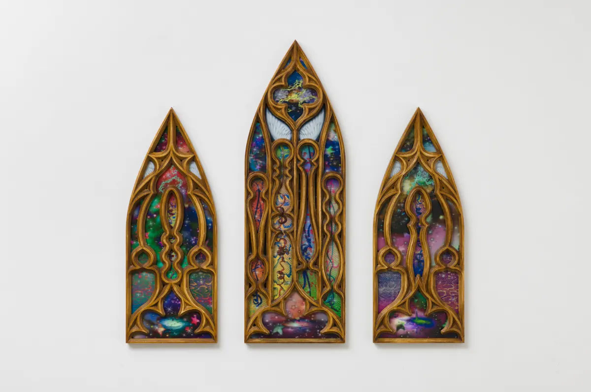 In I Surrender, Dew Kim uses materials such as iron and jesmonite alongside flexible silicone. The physicality of these materials can be read as a sculptural representation of the energy generated at the point of collision between the two axes of religion and queerness. Thus, throughout the exhibition, elements of Gothic architecture like stained glass, wooden frames, iron bars, and window grills are combined with fleshy silicone resembling body parts.