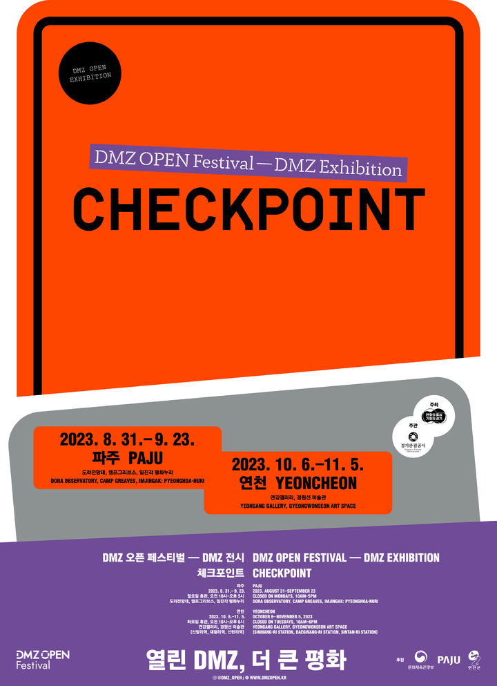 《DMZ 전시: 체크포인트》는 8월 31일부터 9월 23일까지 경기도 파주의 민간인 통제 구역인 도라전망대와 미군기지였던 캠프그리브스 그리고 전쟁 중 북에서 내려온 실향민들이 고향을 그리워하며 방문했던 임진각에 있는 평화누리에서 열립니다. 이어서 10월 6일부터 11월 5일까지는 연천의 민간인 통제 구역 마을에 있는 전시 공간인 연강갤러리와 생태공원 그리고 일제강점기에 북으로 향하던 간이역인 신망리역, 대광리역, 신탄리역에서 전시가 진행됩니다. 이번 전시 장소들은 남북 분단 이전에 북으로 향하던 역, 북을 볼 수 있는 전망대, 한국전쟁 이후 미군이 주둔했던 캠프, 민간인 통제 구역 안의 마을 입구 등 70년간의 남북분단으로 인해 만들지거나 남겨진 장소들입니다.