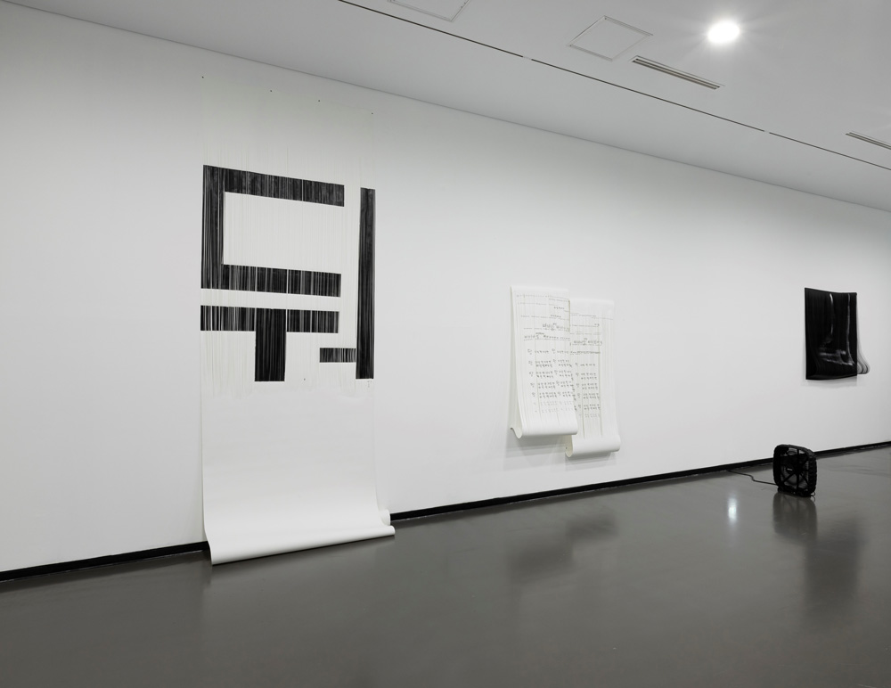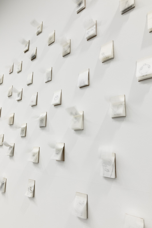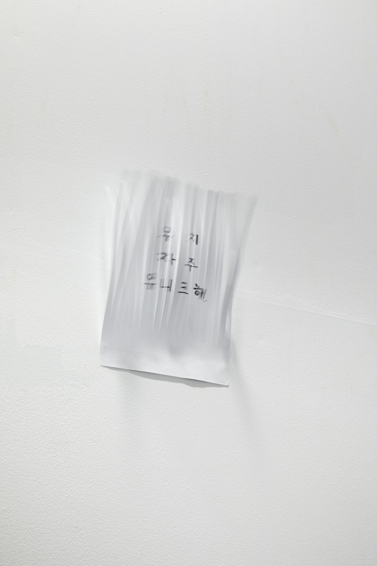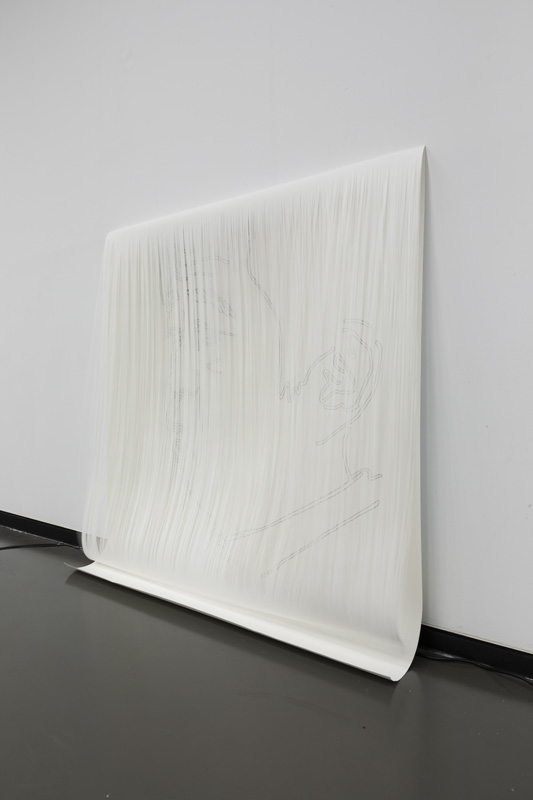 여러 대의 선풍기가 소음을 내며 시원한 바람을 일으킨다. 바람에 펄럭이는 종이조각들이 시선을 잡아끈다. 생경한 풍경에 이끌려 가까이 다가서면 간락한 필선의 드로잉 다발들이 겹겹이 춤을 추듯 움직인다. 한편에선 횡단 또는 종단으로 가늘게 잘려진 종이의 결들이 바람에 미세하게 흔들린다. 종이 위의 드로잉도 잔잔히 물결이 일렁이듯 움직인다.