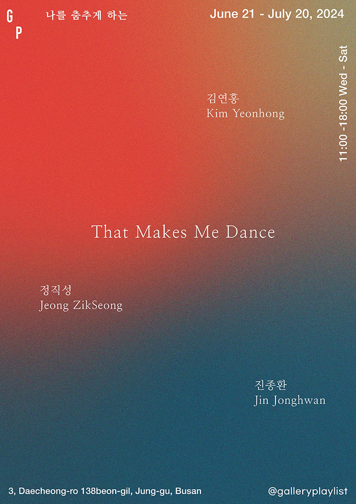 갤러리 플레이리스트는 2024년 6월 21일(금)부터 2024년 7월 20일(토)까지 정직성, 진종환, 김연홍 3인전 《That Makes Me Dance: 나를 춤추게 하는》을 개최한다. 이번 전시는 다양한 세대와 스타일의 예술적 표현이 한 공간에 어우러지는 전시로 세 작가의 작품 총 29점을 관람할 수 있다.